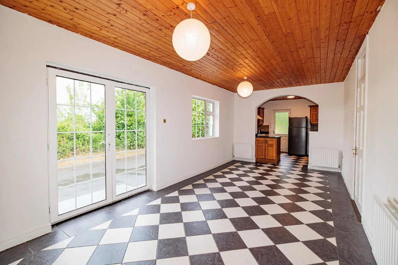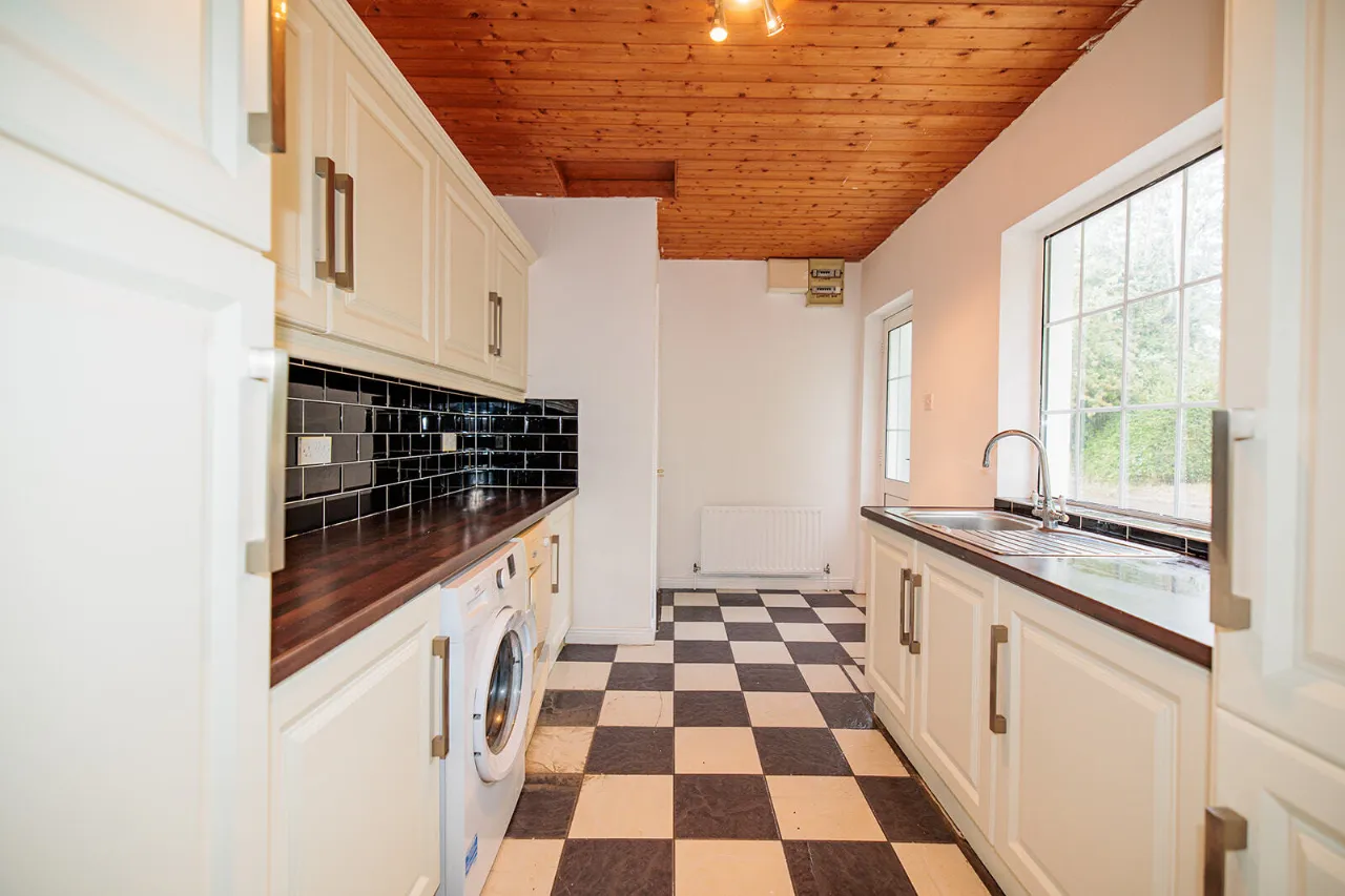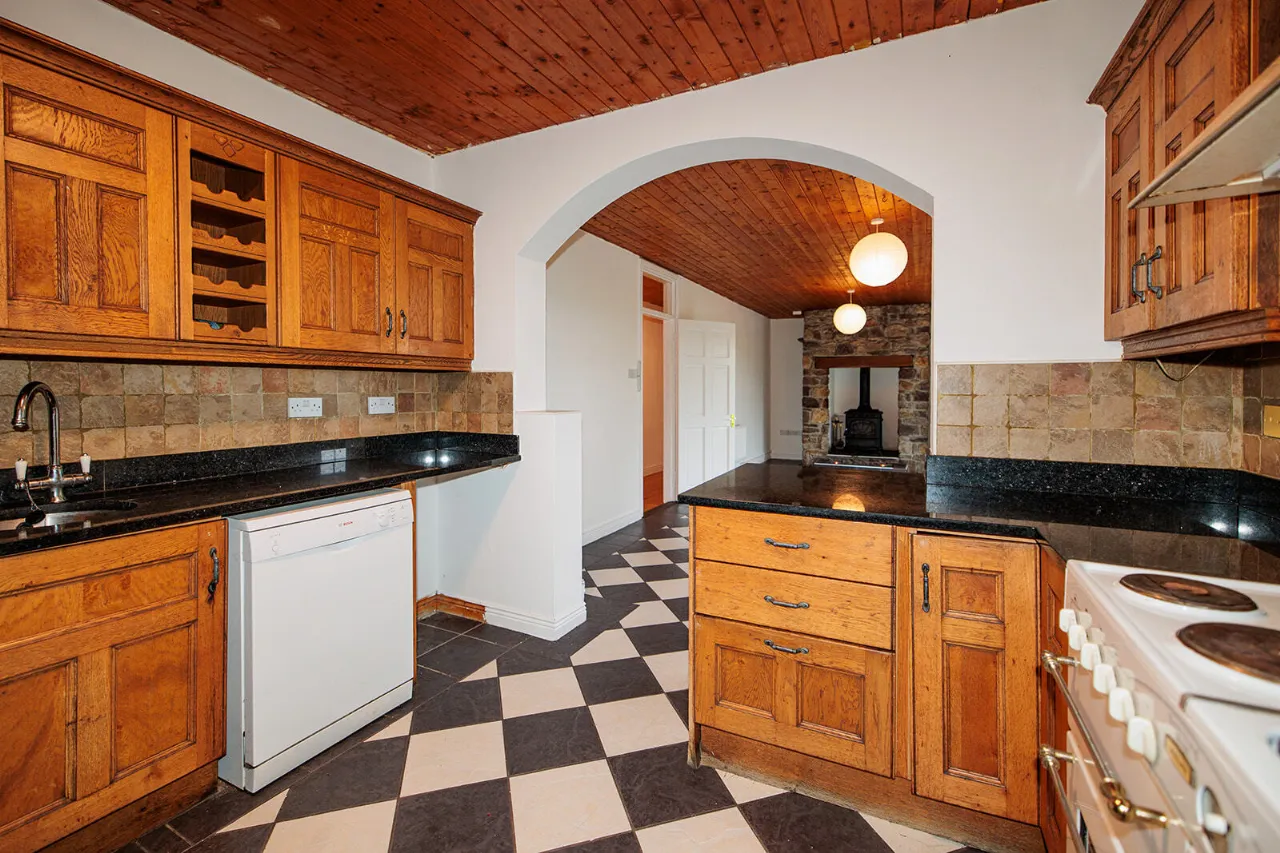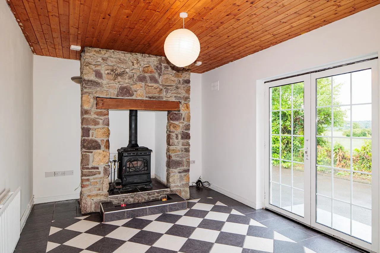 Living / Dining Room 7.53m x 3.27m A sun-drenched and spacious open plan room with lovely viewings of the adjoining farmland and surrounding countryside. Floor to ceiling stone chimney breast with a wooden beam, fitted with a multi-fuel stove. PVC French doors open out to the rear of the property. Tiled floor and stained tongue and groove floorboards. The dining area can accommodate a large table and chairs for family dining and entertaining. Window to the rear of the property. Archway with open plan access to the kitchen.