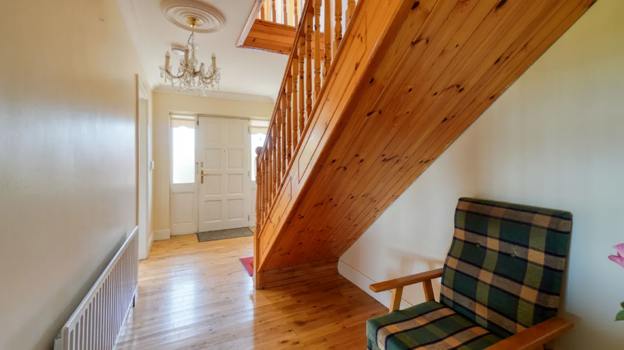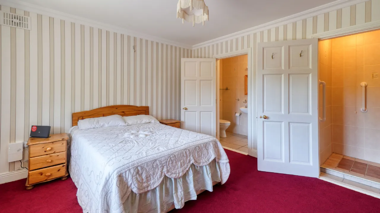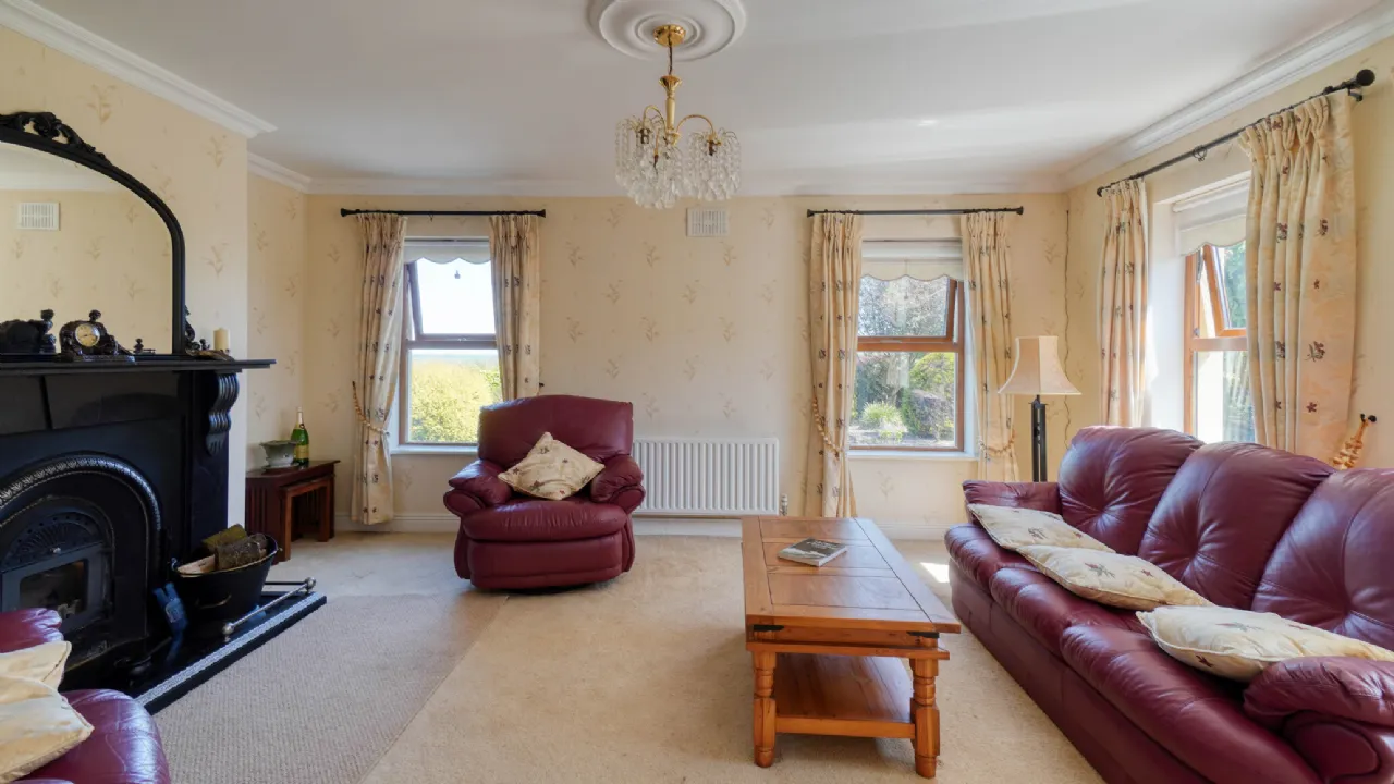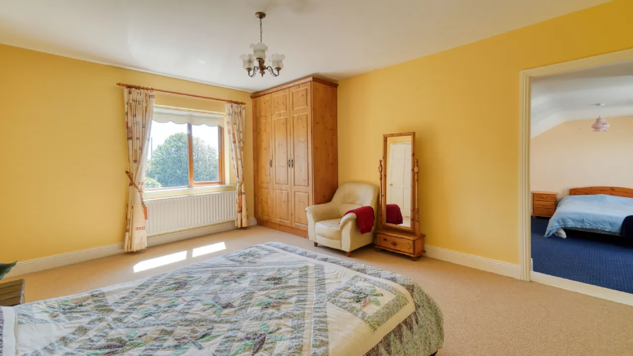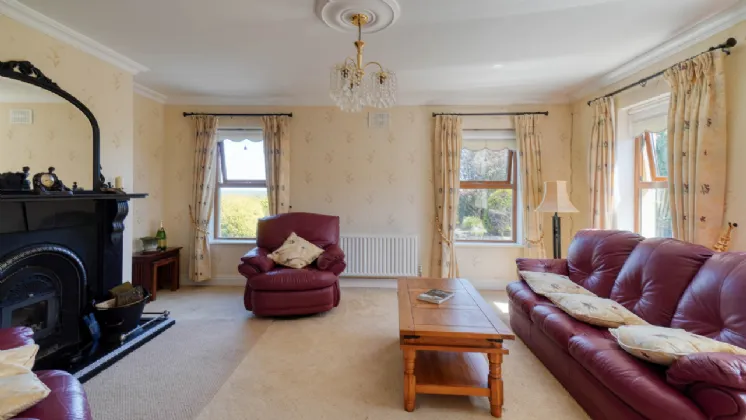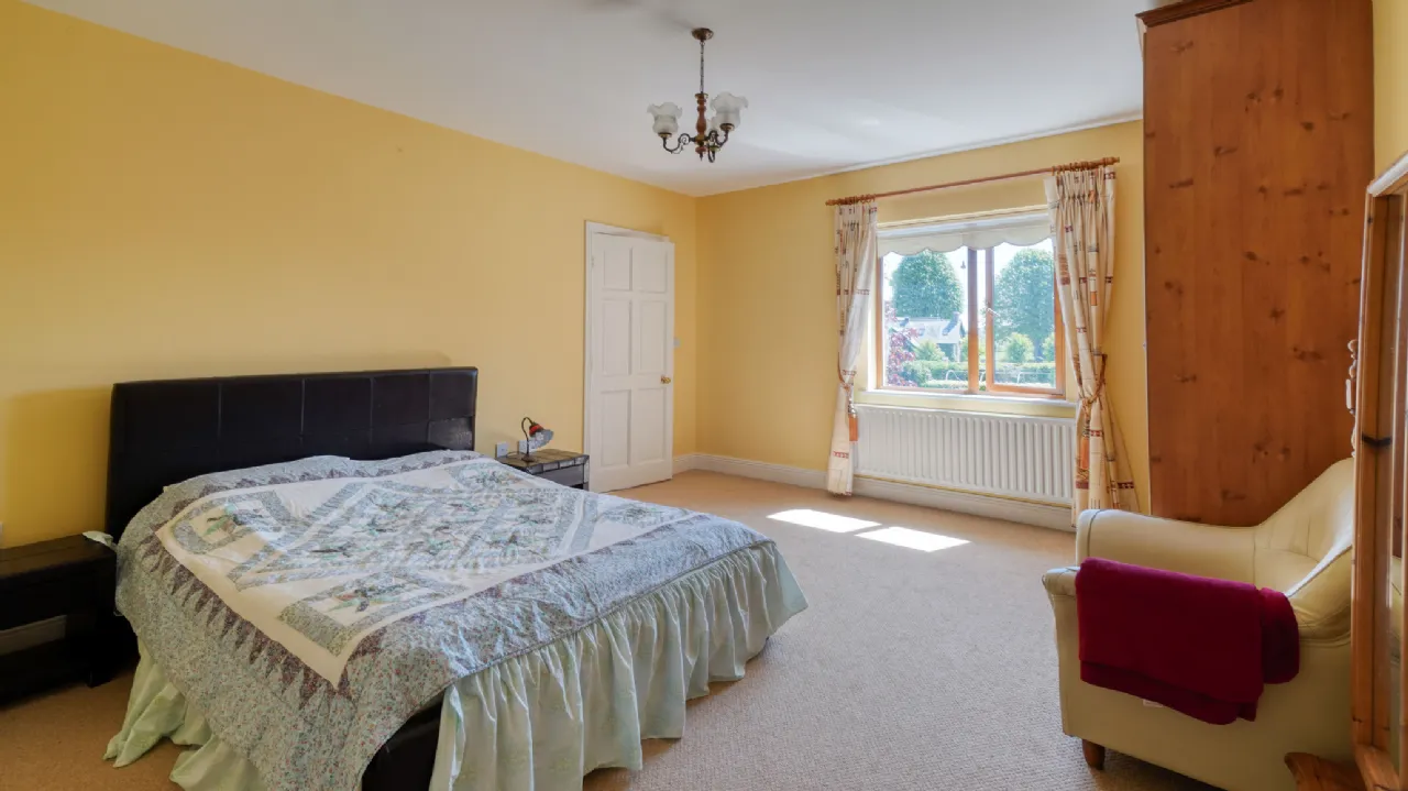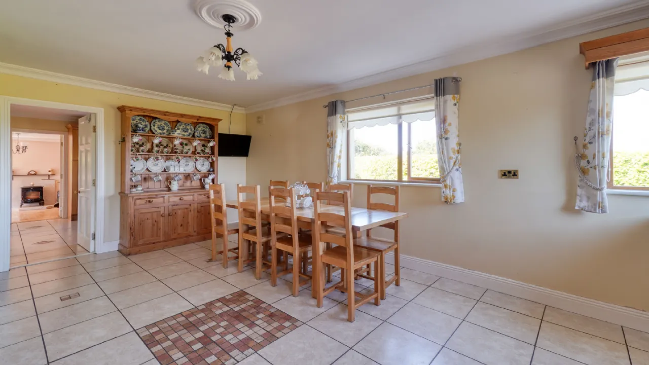 Entrance: A welcoming red front door and sheltered porch set a warm tone for this delightful country home, flanked by symmetrical front windows and framed by vibrant planting. Hallway Entrance Hall: The bright and airy entrance hall features polished wood flooring, a classic wooden staircase with panelling, and a decorative chandelier, creating an inviting first impression. Living/Dining Room Main Reception Room: This spacious dual-aspect living and dining area is filled with natural light from large windows. It features polished timber floors, elegant ceiling coving, dual chandeliers, and a solid-fuel stove set into a granite hearth—offering warmth and charm in one. Dining Area: Ample space for an 8-seater dining table makes this room ideal for entertaining or large family meals. Ground Floor Bedroom & Ensuite Downstairs Bedroom: This comfortable double bedroom features striped wallpaper, fitted carpet, and built-in storage. It’s perfect as a guest room or for accessible living. Ensuite/Wet Room: The ensuite includes a step-in tiled wet room with electric shower and support rails, ideal for ease of access, along with a WC and pedestal sink.
