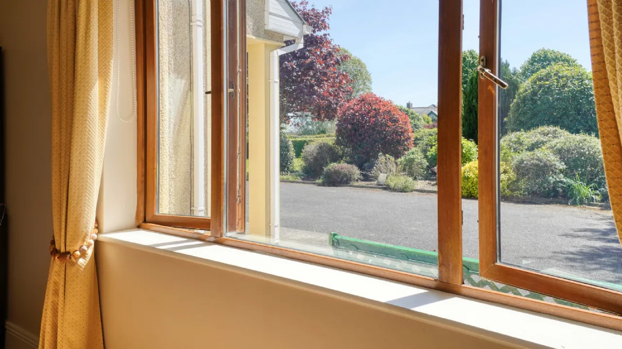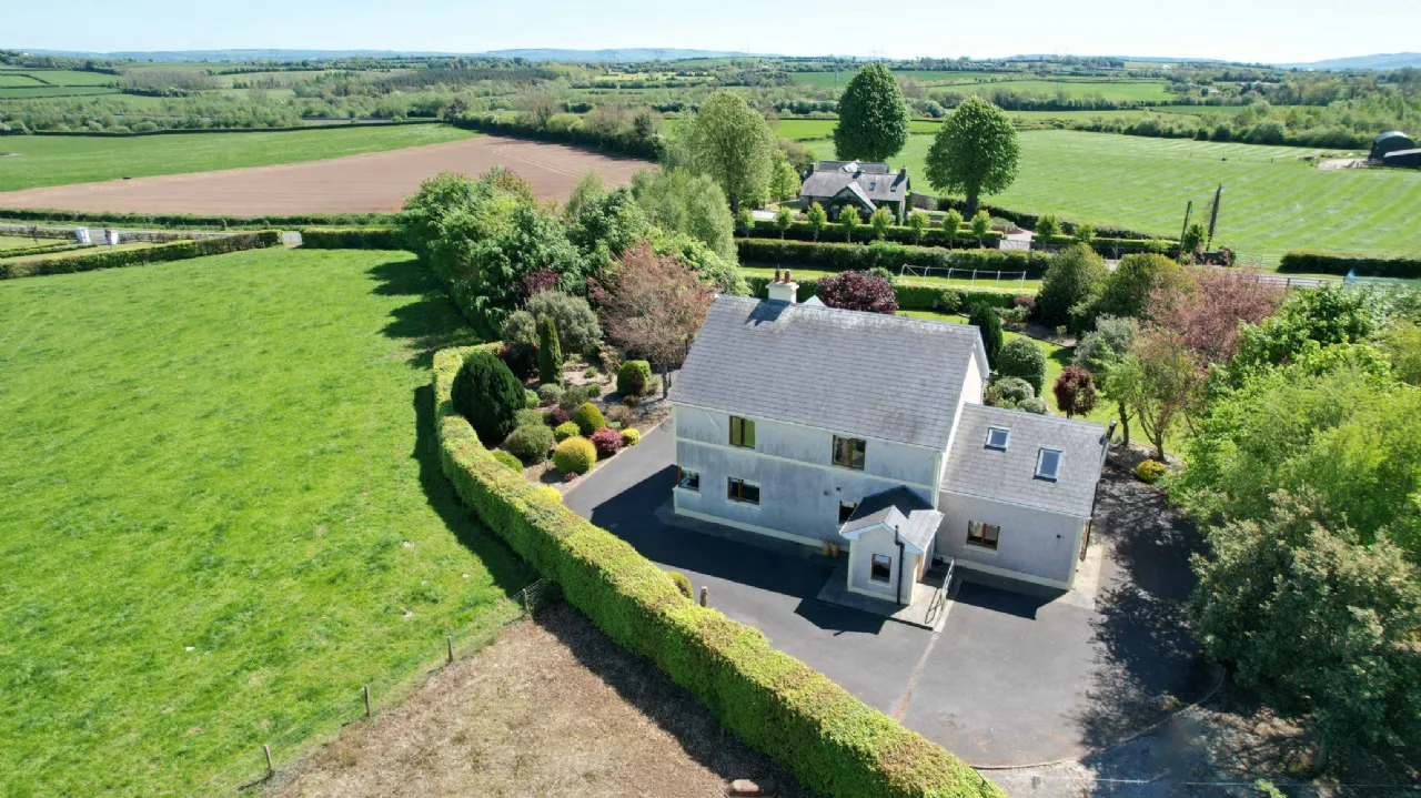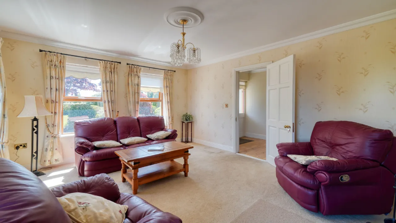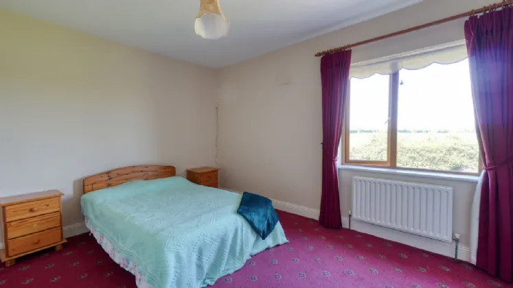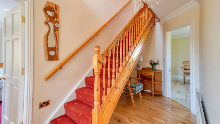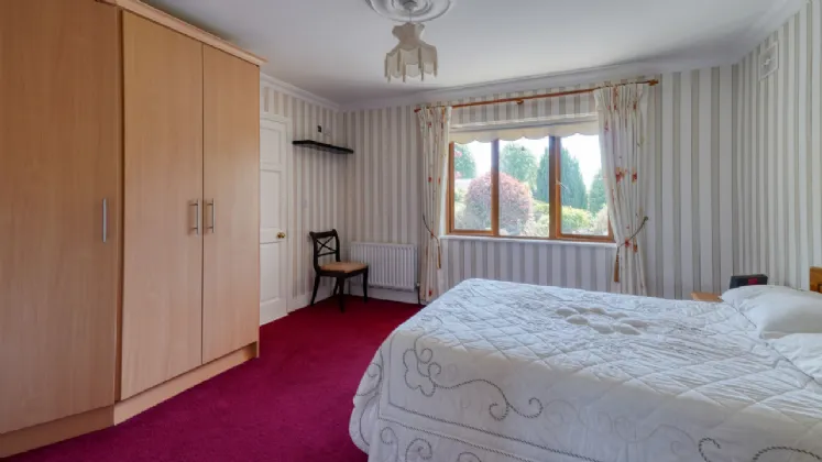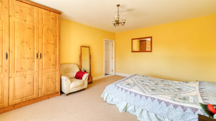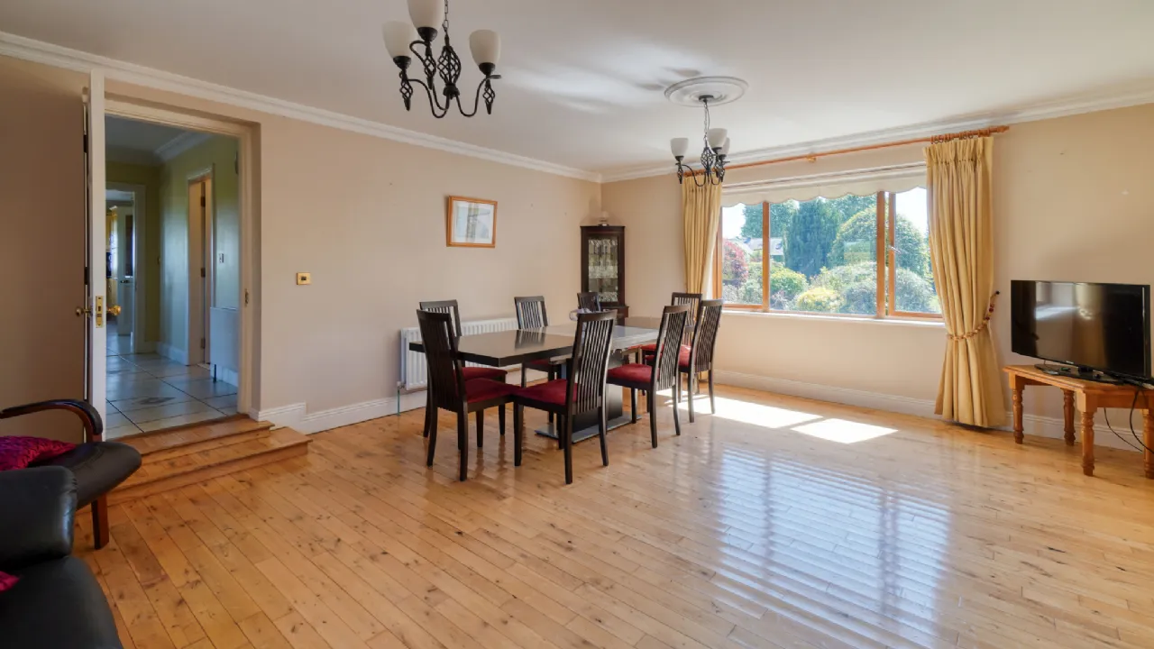 Entrance: A welcoming red front door and sheltered porch set a warm tone for this delightful country home, flanked by symmetrical front windows and framed by vibrant planting. Hallway Entrance Hall: The bright and airy entrance hall features polished wood flooring, a classic wooden staircase with panelling, and a decorative chandelier, creating an inviting first impression. Living/Dining Room Main Reception Room: This spacious dual-aspect living and dining area is filled with natural light from large windows. It features polished timber floors, elegant ceiling coving, dual chandeliers, and a solid-fuel stove set into a granite hearth—offering warmth and charm in one. Dining Area: Ample space for an 8-seater dining table makes this room ideal for entertaining or large family meals. Ground Floor Bedroom & Ensuite Downstairs Bedroom: This comfortable double bedroom features striped wallpaper, fitted carpet, and built-in storage. It’s perfect as a guest room or for accessible living. Ensuite/Wet Room: The ensuite includes a step-in tiled wet room with electric shower and support rails, ideal for ease of access, along with a WC and pedestal sink.