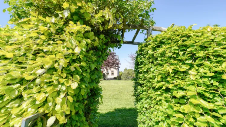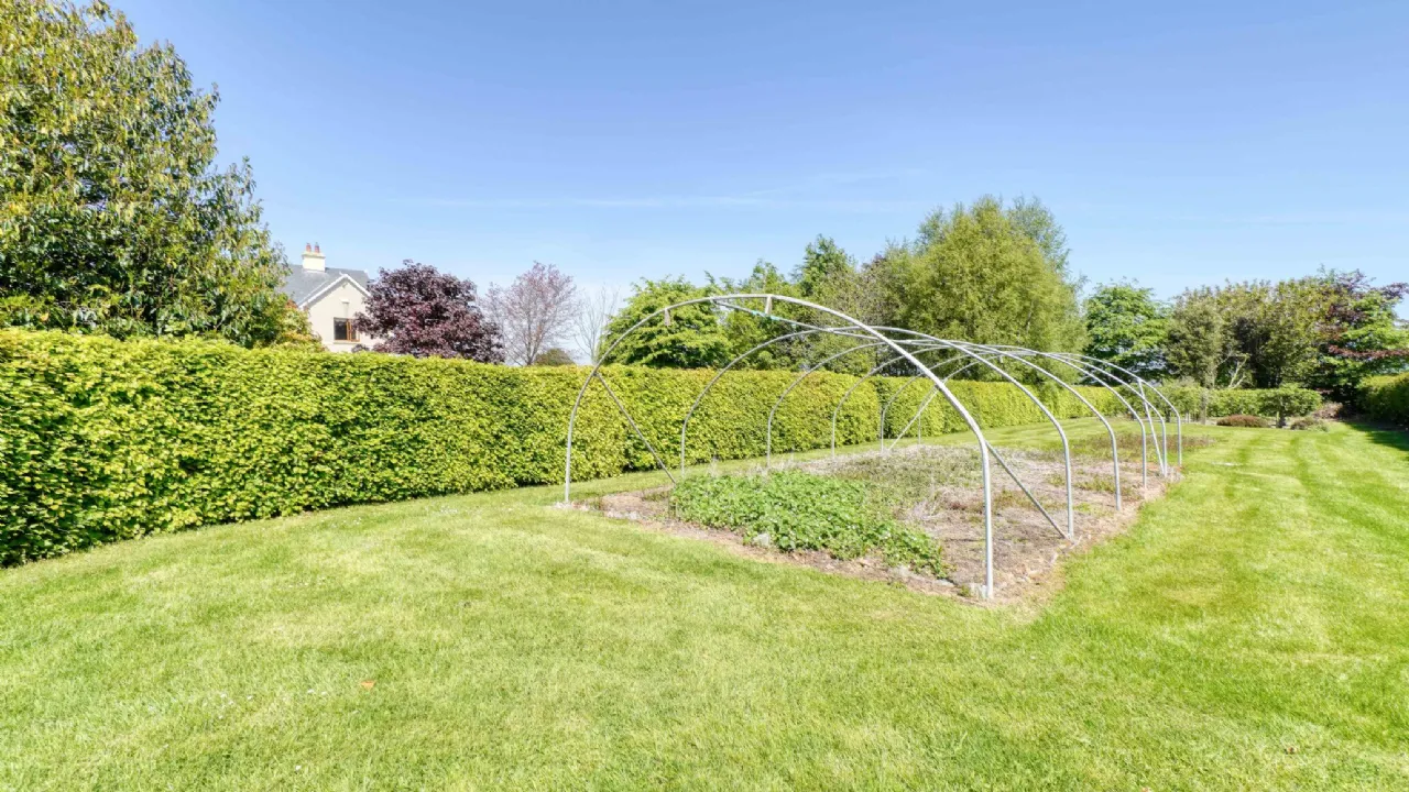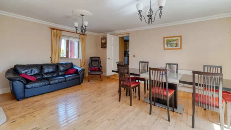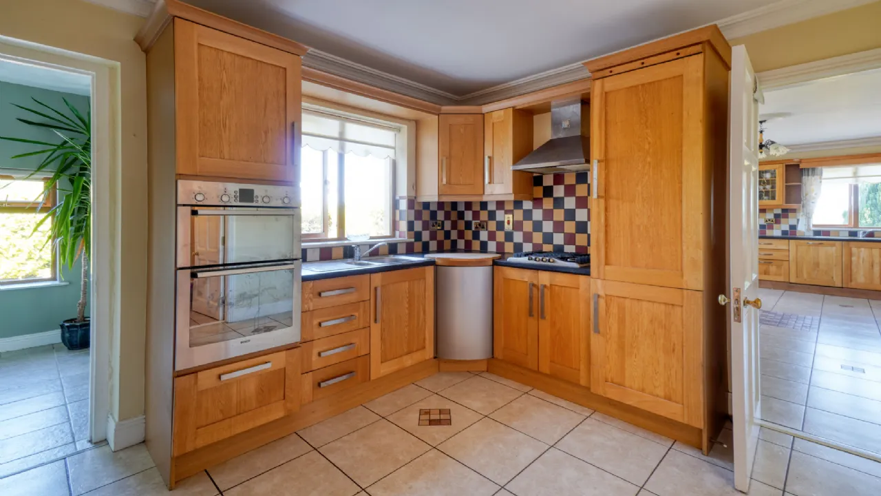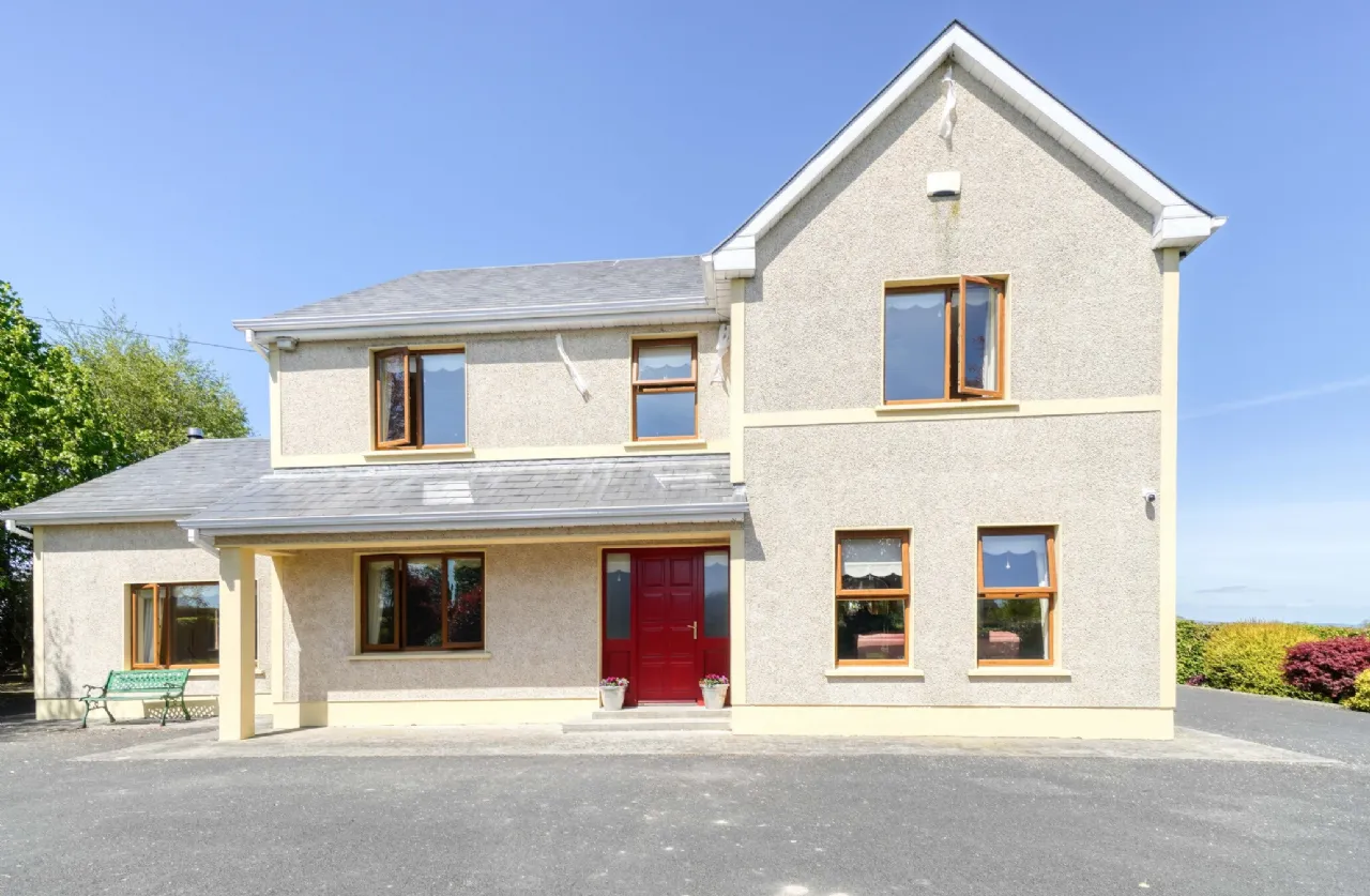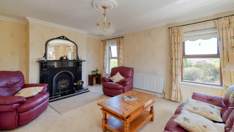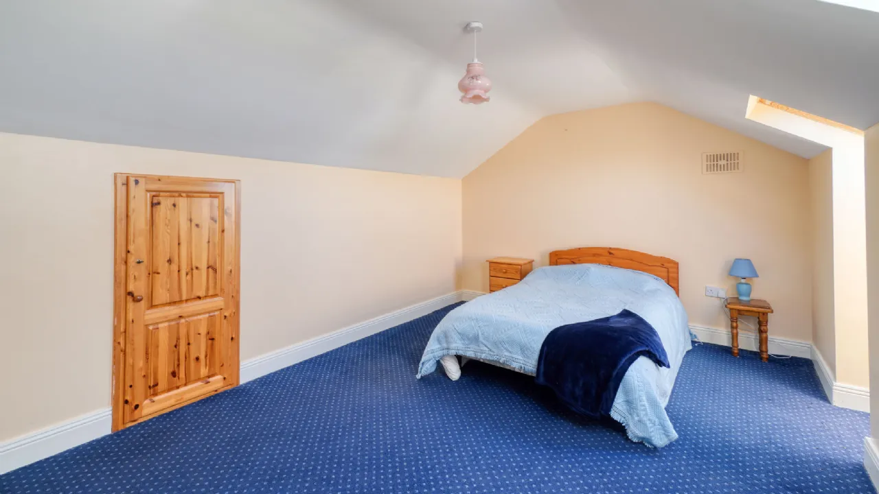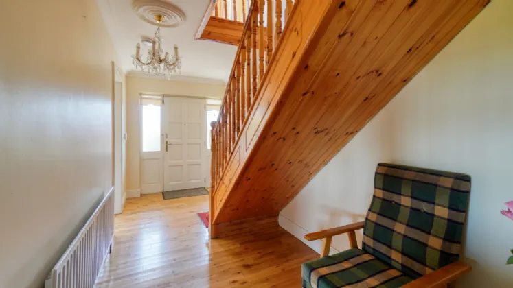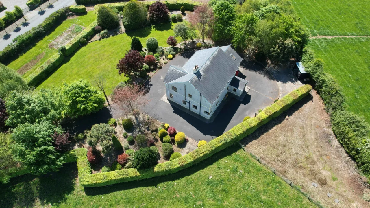 Entrance: A welcoming red front door and sheltered porch set a warm tone for this delightful country home, flanked by symmetrical front windows and framed by vibrant planting. Hallway Entrance Hall: The bright and airy entrance hall features polished wood flooring, a classic wooden staircase with panelling, and a decorative chandelier, creating an inviting first impression. Living/Dining Room Main Reception Room: This spacious dual-aspect living and dining area is filled with natural light from large windows. It features polished timber floors, elegant ceiling coving, dual chandeliers, and a solid-fuel stove set into a granite hearth—offering warmth and charm in one. Dining Area: Ample space for an 8-seater dining table makes this room ideal for entertaining or large family meals. Ground Floor Bedroom & Ensuite Downstairs Bedroom: This comfortable double bedroom features striped wallpaper, fitted carpet, and built-in storage. It’s perfect as a guest room or for accessible living. Ensuite/Wet Room: The ensuite includes a step-in tiled wet room with electric shower and support rails, ideal for ease of access, along with a WC and pedestal sink.