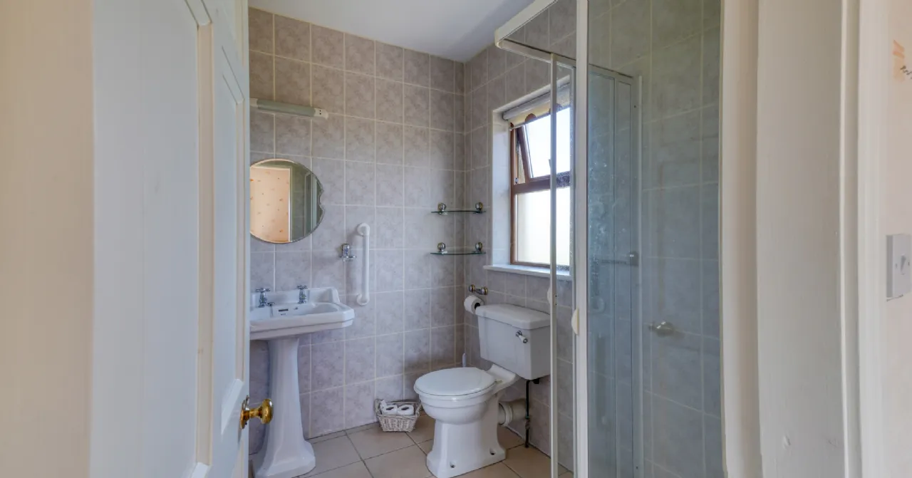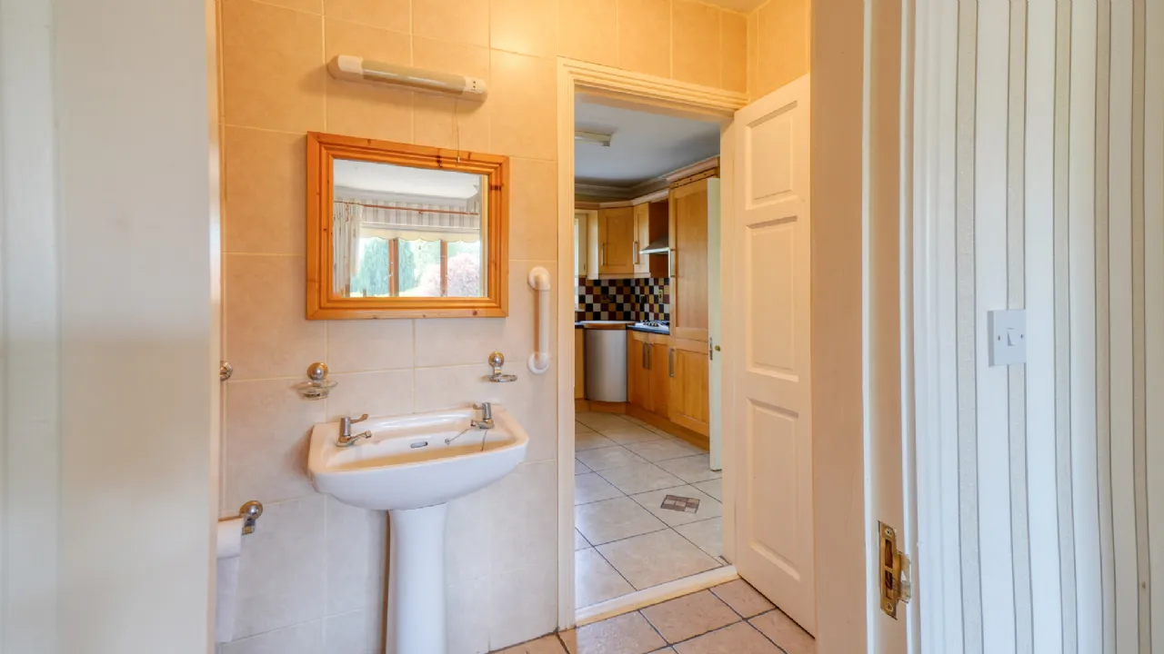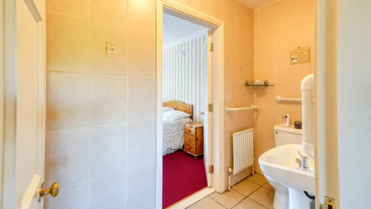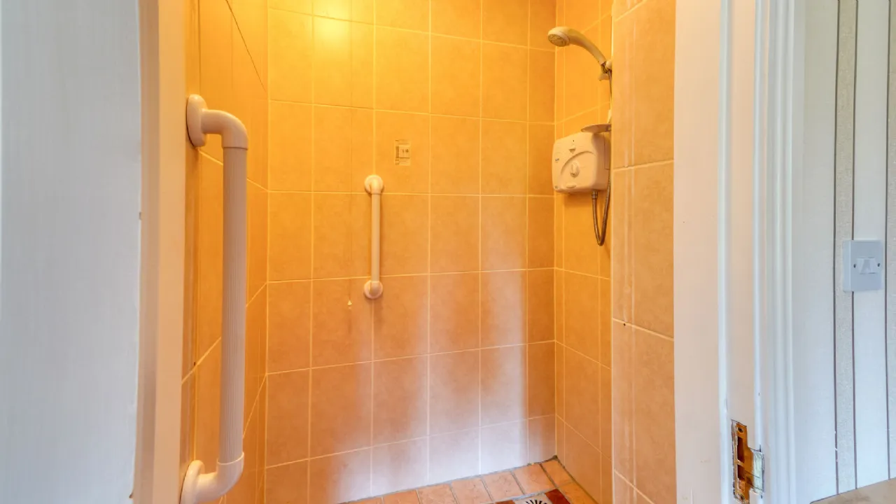 Bedroom ensuite 2.65 x 1.21m This ground-floor bedroom includes an en-suite with a fully tiled shower room, fitted grab rails for accessibility, and dual access from both the bedroom and adjacent hallway. Ideal as a guest suite or for those seeking single-level living.