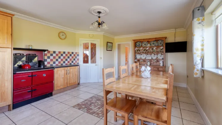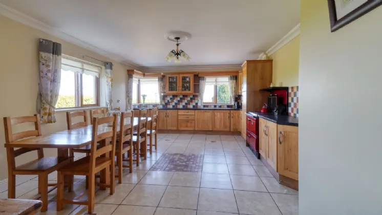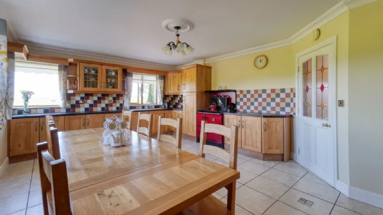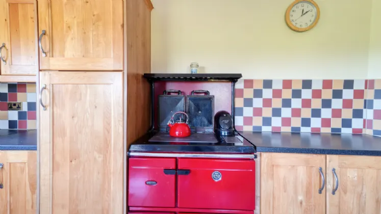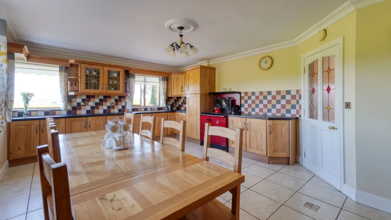 Kitchen 6.29 x 4.35m This spacious country-style kitchen is filled with natural light and features solid wood cabinetry, a classic red Stanley range cooker, and tiled flooring throughout. A large dining area comfortably seats eight, perfect for family gatherings, while multiple windows offer charming views of the surrounding countryside.