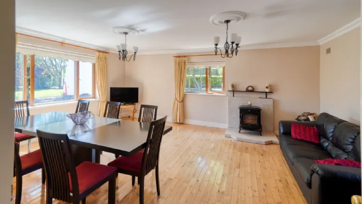 Living Room 4.14 x 5.37m This bright and spacious living/dining area features polished wooden flooring, large windows that flood the room with natural light, and a cozy solid fuel stove. There's ample space for both relaxation and entertaining, with garden views adding to the warm and inviting atmosphere.