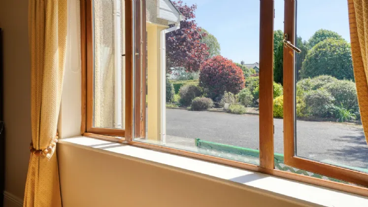 Bedroom 4.16 x 3.86m This ground floor bedroom offers a spacious and bright layout with a large window overlooking the landscaped front garden. The room features built-in wardrobes, a double bed with matching bedside lockers, and direct access to a private ensuite complete with shower, toilet, and sink—perfect for convenience and privacy.