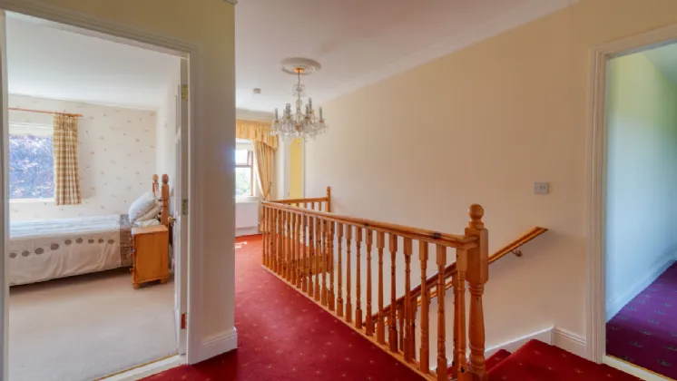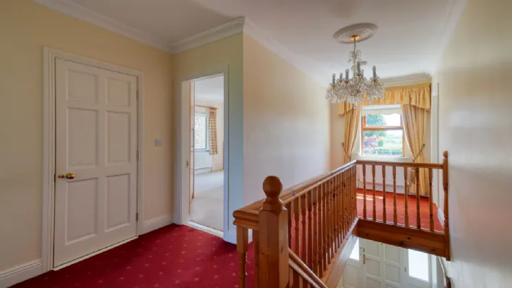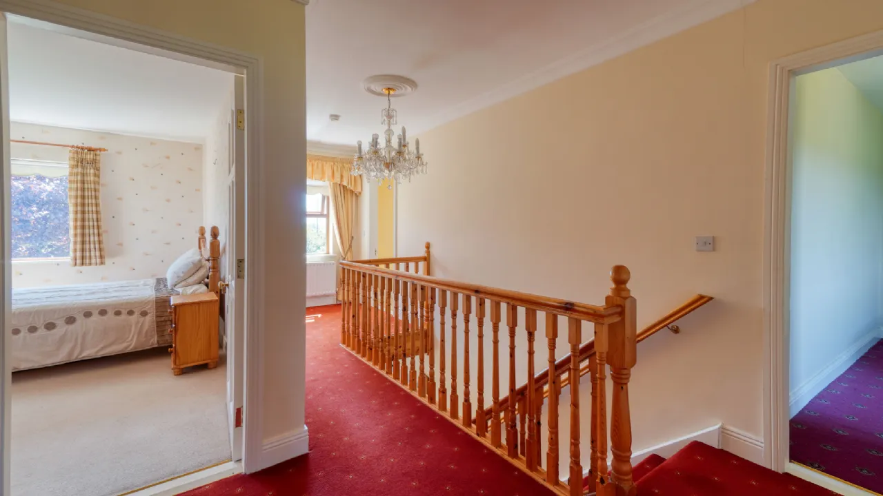 The upstairs of this charming home offers a bright and spacious landing with a feature chandelier and countryside views. It comprises 5 generously sized bedrooms, including one en suite, and a large family bathroom, all presented in warm, welcoming tones.