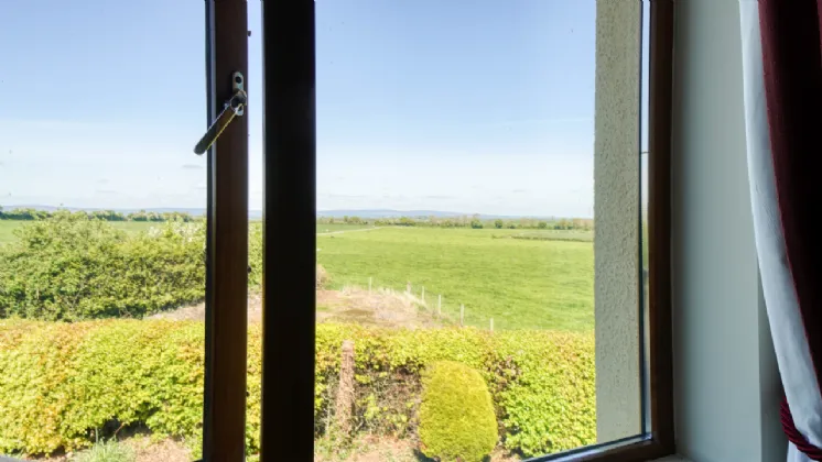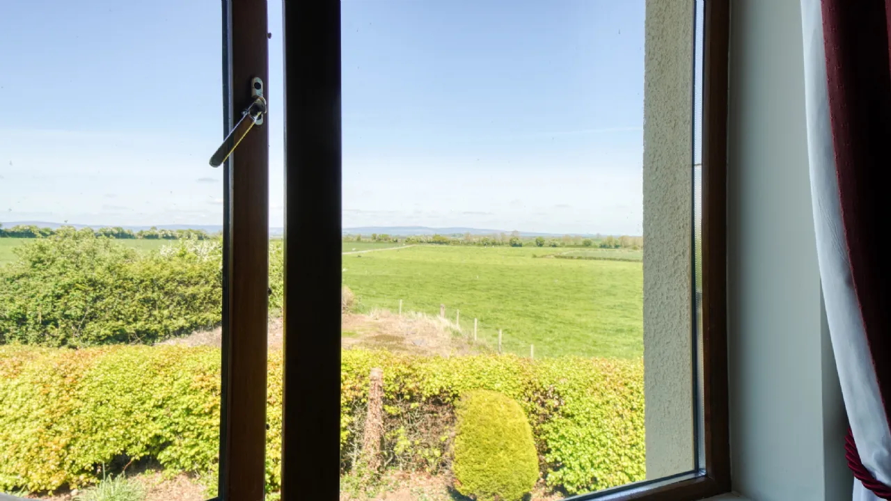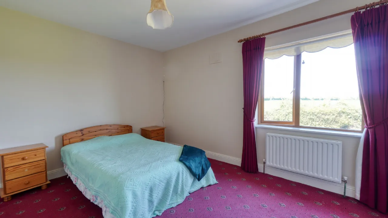 Bedroom 3 4.09 x 3.39m Bedroom Three is a bright and comfortable double room positioned on the upper floor, offering scenic views over the surrounding countryside through a large picture window. The room is finished in a neutral palette with a soft, patterned carpet and rich curtains, creating a warm and inviting atmosphere. It includes two pine bedside units and offers ample space for additional furnishings or built-in storage. This room is ideal as a guest bedroom, children's room, or home office, with plenty of natural light and a peaceful rear aspect.