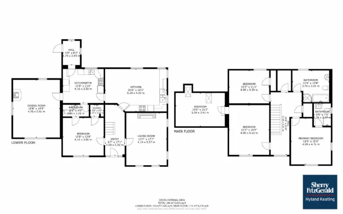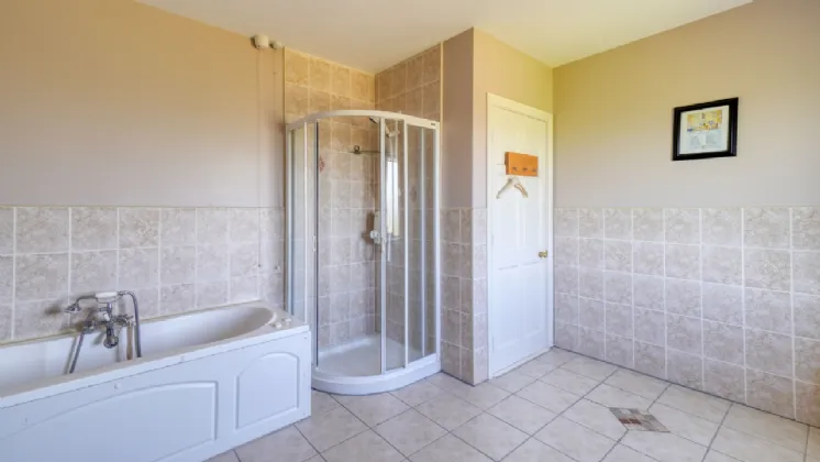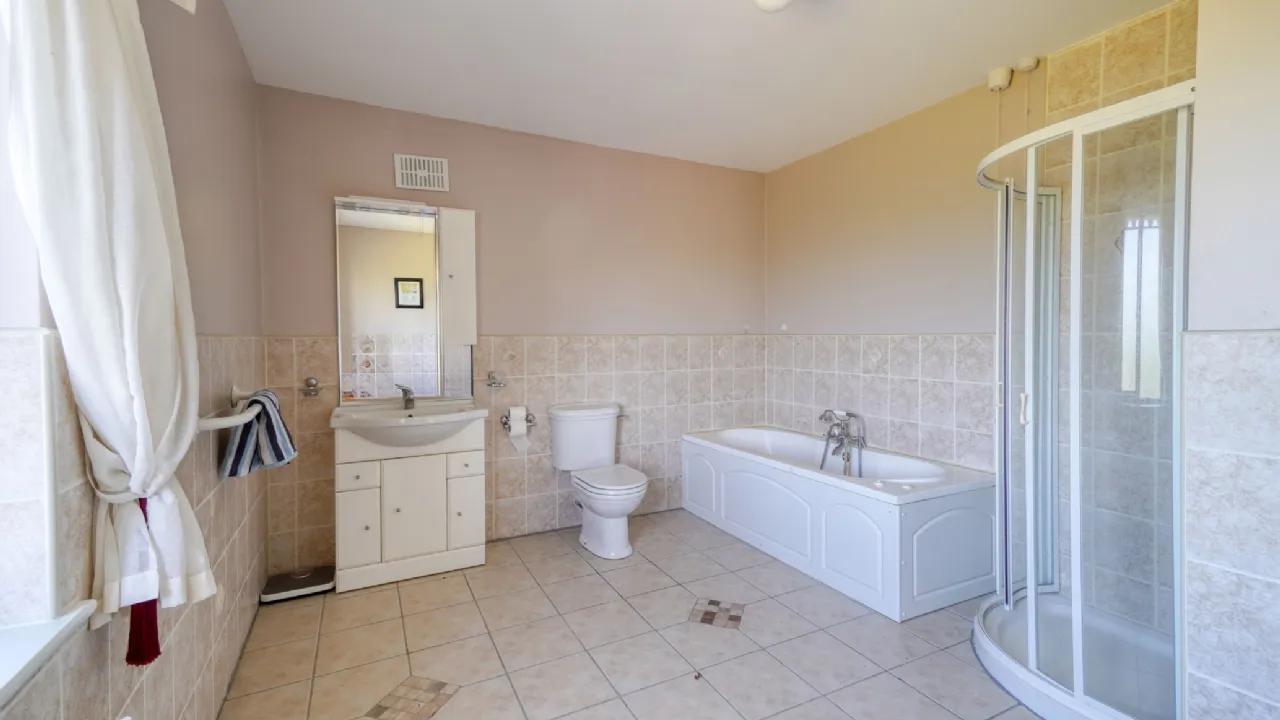 Upstairs Main Bathroom 3.76 x 3.25m The upstairs family bathroom is a spacious, well-appointed retreat featuring both a full-size bathtub and a separate corner shower unit with sliding glass doors. The room is tiled throughout with a mix of neutral beige wall tiles and coordinating floor tiles with decorative insets, creating a cohesive and low-maintenance finish. A white vanity unit with integrated sink and mirrored cabinet above offers practical storage, while a large window floods the space with natural light. This bathroom combines functionality with comfort, making it ideal for family living.