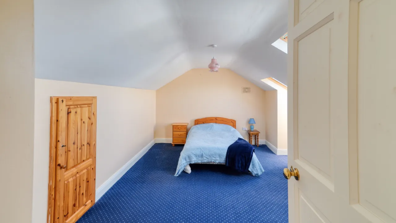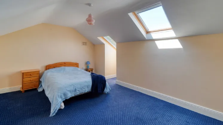 Bedroom 2 5.04 x 3.41m Bedroom Two is a charming and well-proportioned space located on the upper floor, ideal as a double guest bedroom or cozy retreat. The room features a vaulted ceiling that adds character and volume, complemented by soft-toned walls and a plush blue carpet for a relaxing ambiance. A Velux window fills the space with natural light while offering pleasant views of the surrounding greenery. Built-in storage is tucked cleverly under the eaves, maximizing space without compromising floor area. This inviting room flows directly from Bedroom One, making it especially suitable as a nursery, home office, or extended suite.