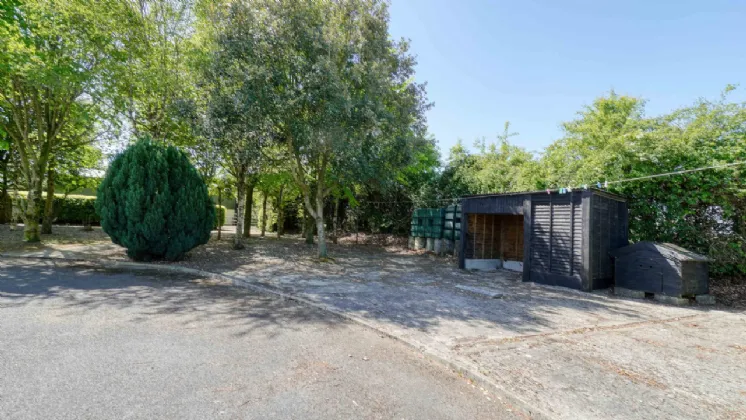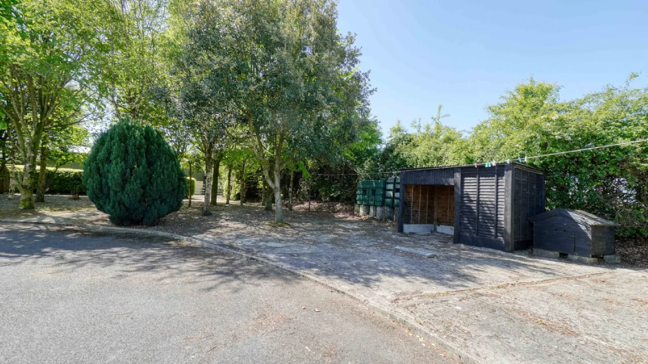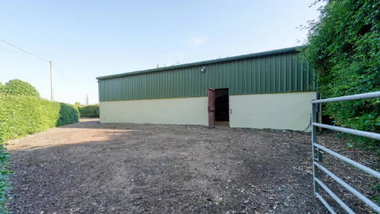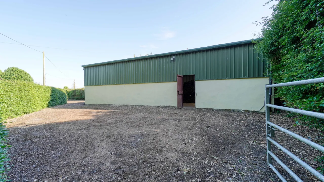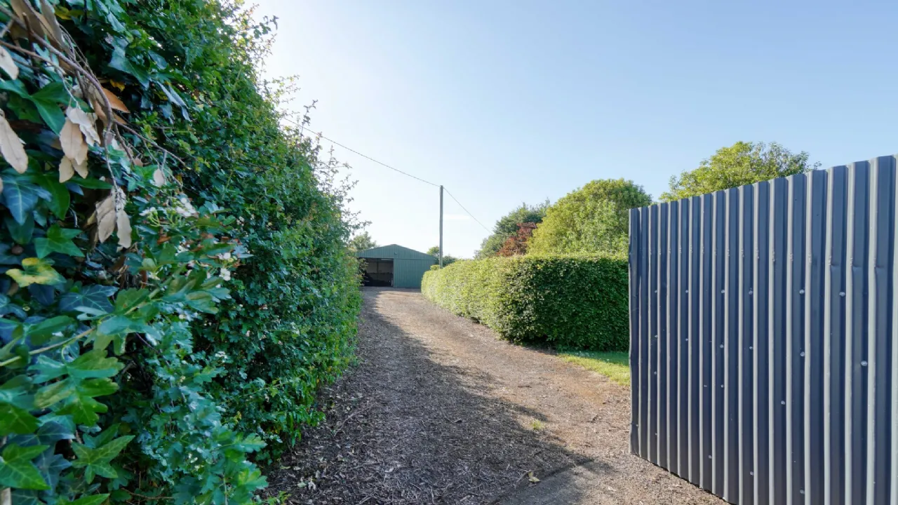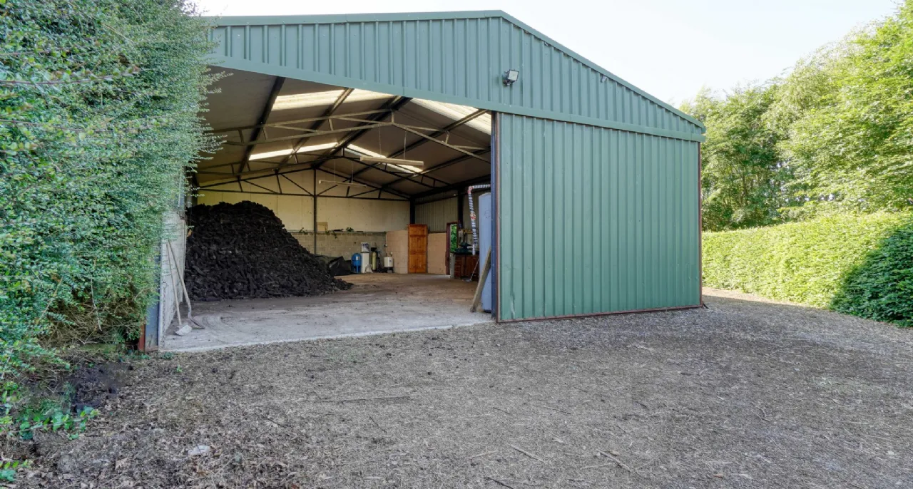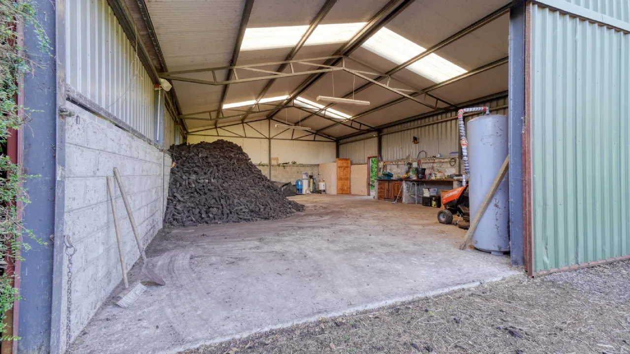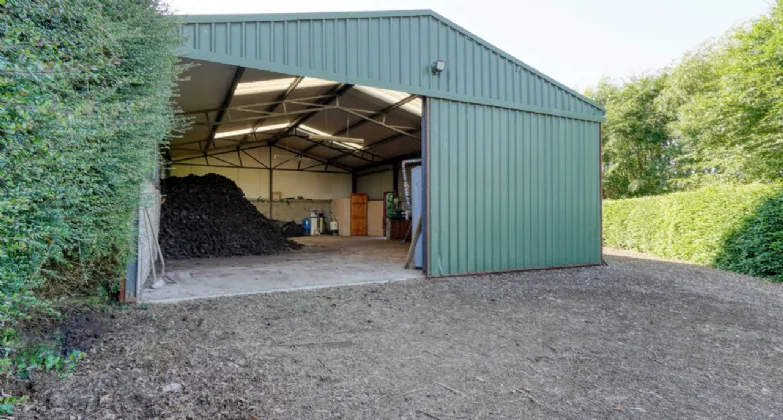 Spacious Steel-Framed Shed with Workshop Accessed via a private, tree-lined laneway, this robust steel-framed shed is ideal for agricultural, storage, or workshop use. It features concrete block walls, corrugated steel cladding, and high ceilings with skylights for natural light. Double sliding doors open to a large concrete-floored interior, with a dedicated workshop area, shelving, and a hot water cylinder. A separate side door offers easy pedestrian access. Surrounded by mature hedging and secured with gated entry, this versatile outbuilding provides excellent functionality in a private, well-maintained setting.