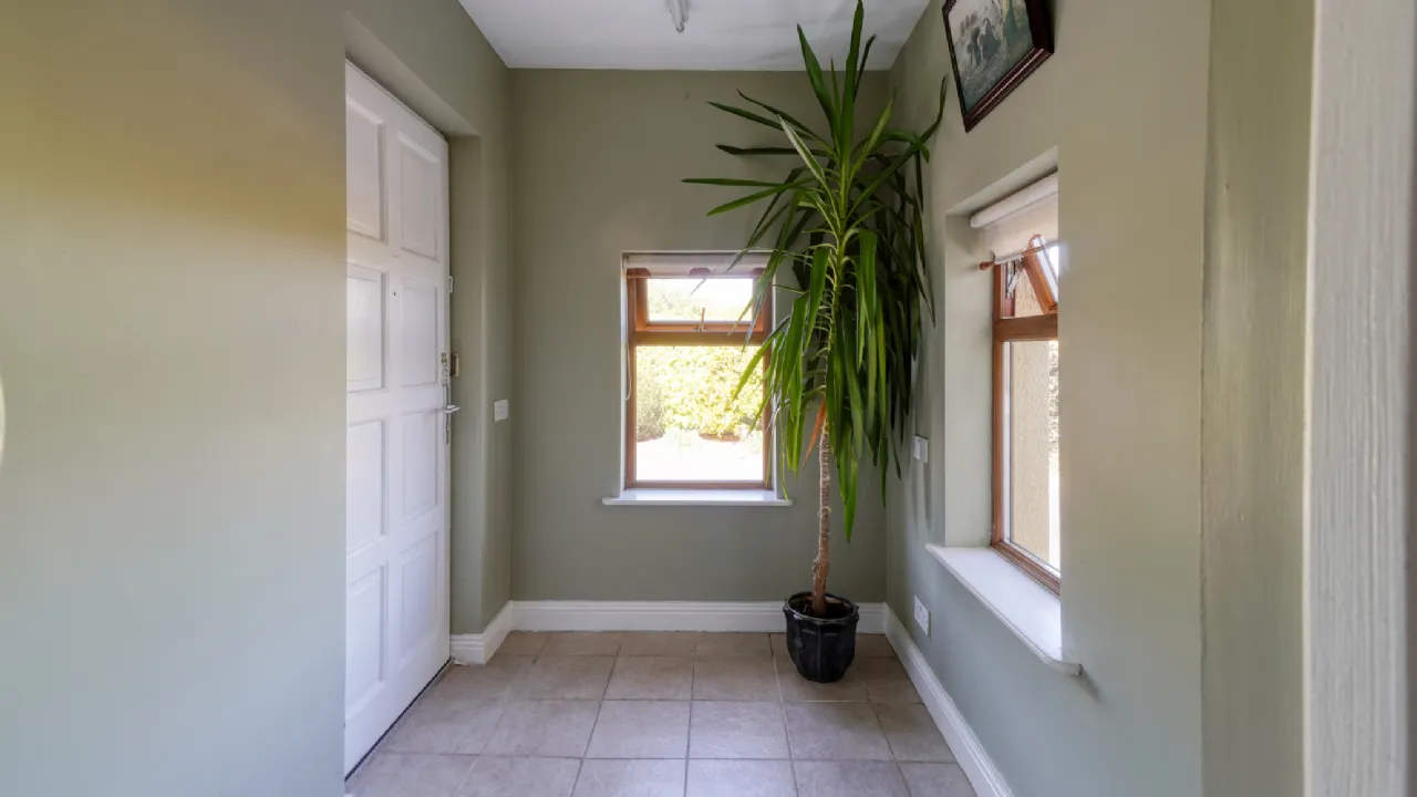 Hall 1.75 x 2.49m This bright and airy side hall features neutral green walls, tiled flooring, and multiple windows that fill the space with natural light. Ideal as a rear or side entrance, it offers a clean and practical transition area with garden views.