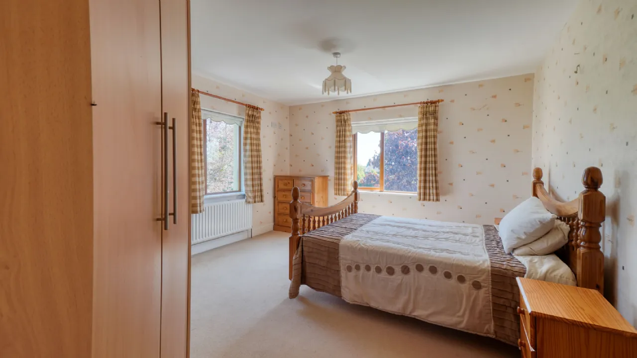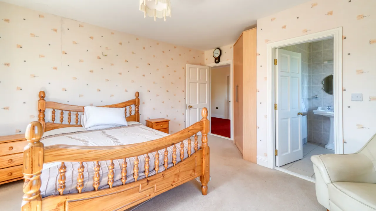 Primary Bedroom Upstairs 4.09 x 4.71m This bright and spacious primary bedroom is a well-appointed retreat, offering comfort and privacy. The room is generously sized with soft carpeting and neutral wallpaper, creating a calming and timeless atmosphere. Large dual-aspect windows flood the room with natural light and provide lovely views of the surrounding gardens. This bedroom includes built-in wardrobes for ample storage, as well as direct access to a private ensuite bathroom with tiled walls and classic white sanitary ware. The layout accommodates a full-size bed with space for additional furnishings such as a vanity or armchair.
