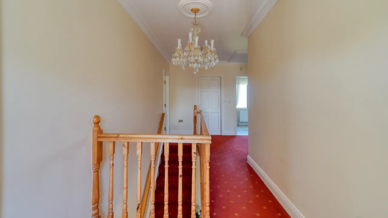 Upstairs Hall 3.18 x 6.41m This bright and inviting upstairs hallway offers a lovely connection between the bedrooms and main bathroom of the home. Featuring plush red carpeting, a classic timber banister, and crown molding for added elegance, the space is well-lit by a large front-facing window that floods the area with natural light. A crystal-style chandelier adds a touch of sophistication, while neutral wall tones create a warm and welcoming atmosphere. This space is both functional and stylish, providing a charming transition between rooms on the upper floor.