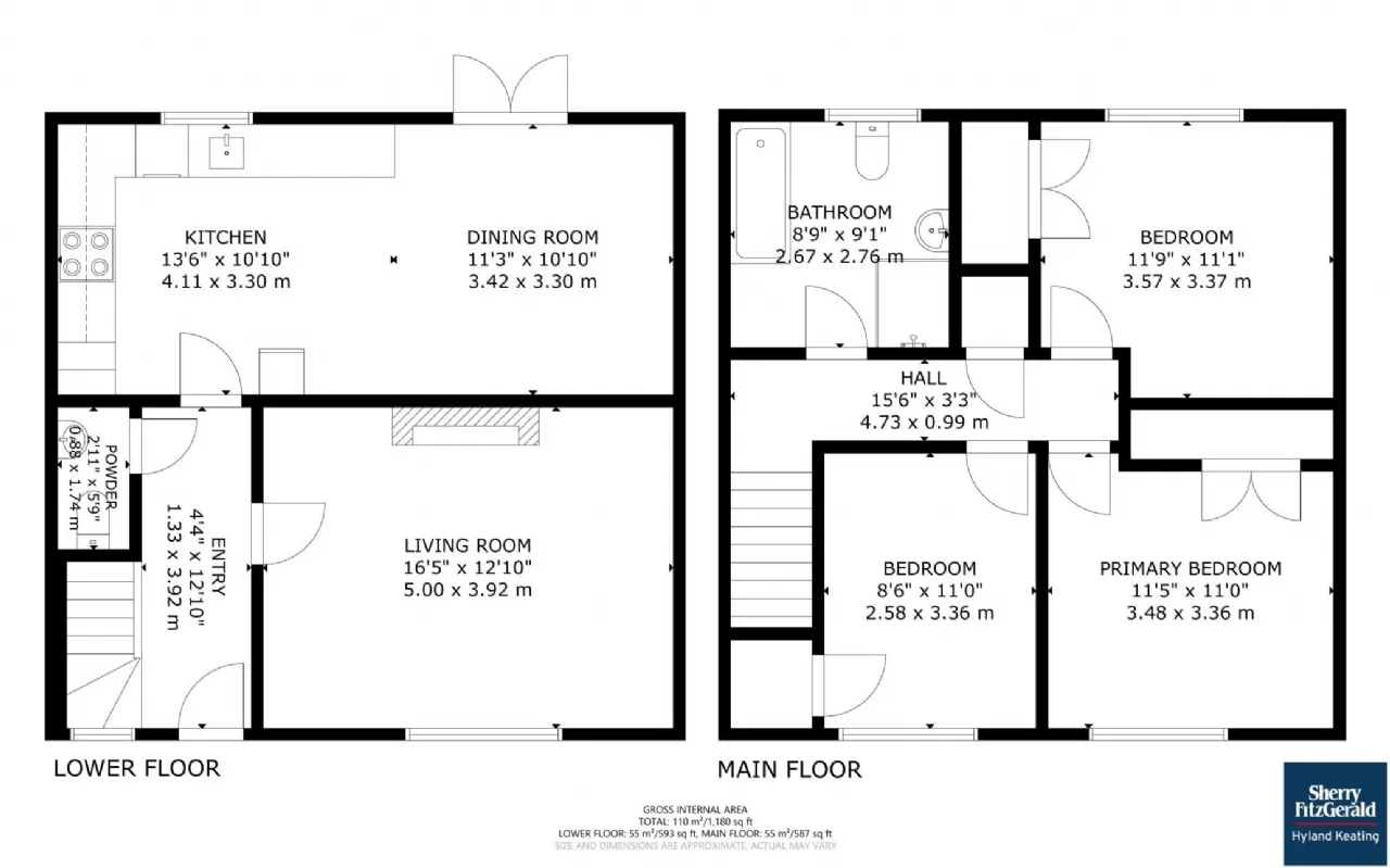 Kitchen: 4.11m x 3.3m This bright and spacious open-plan kitchen and dining area features classic cabinetry, tiled flooring, and direct access to the garden—ideal for family living and entertaining.