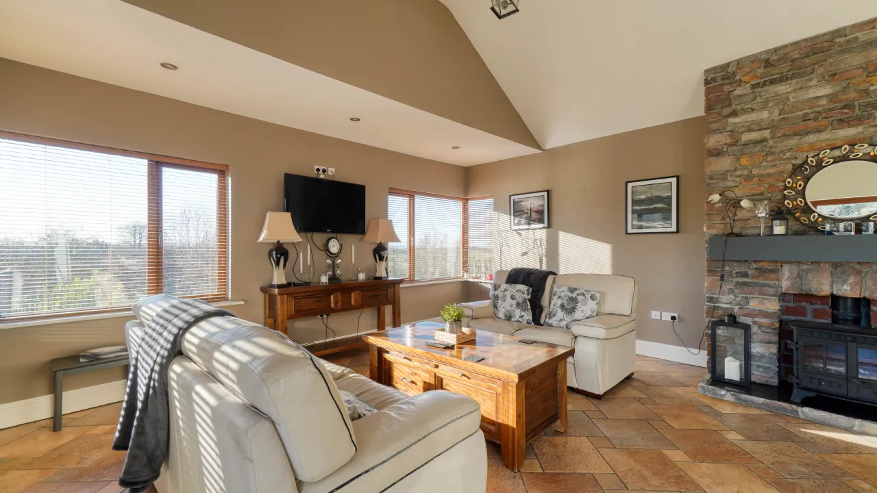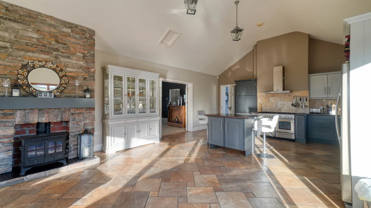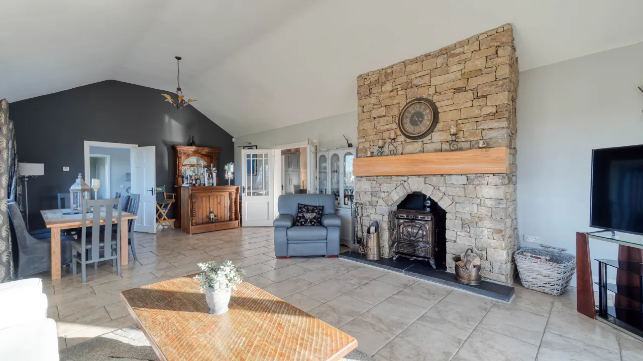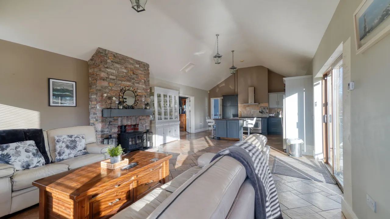 As you approach via the private driveway, the home's striking façade, featuring natural stonework and expansive windows, immediately sets the tone for the sophistication within. The main entrance welcomes you to a spacious and bright hallway, leading to the heart of the home a beautifully designed open-plan kitchen, dining, and living area, where vaulted ceilings and large picture windows flood the space with natural light. The country-style kitchen, complete with bespoke cabinetry, an island unit, and modern appliances, flows effortlessly into a charming living area, enhanced by a rustic stone fireplace and a solid-fuel stove, creating a warm and inviting ambiance. French doors lead to an outdoor balcony, the perfect spot for morning coffee while taking in the panoramic views.