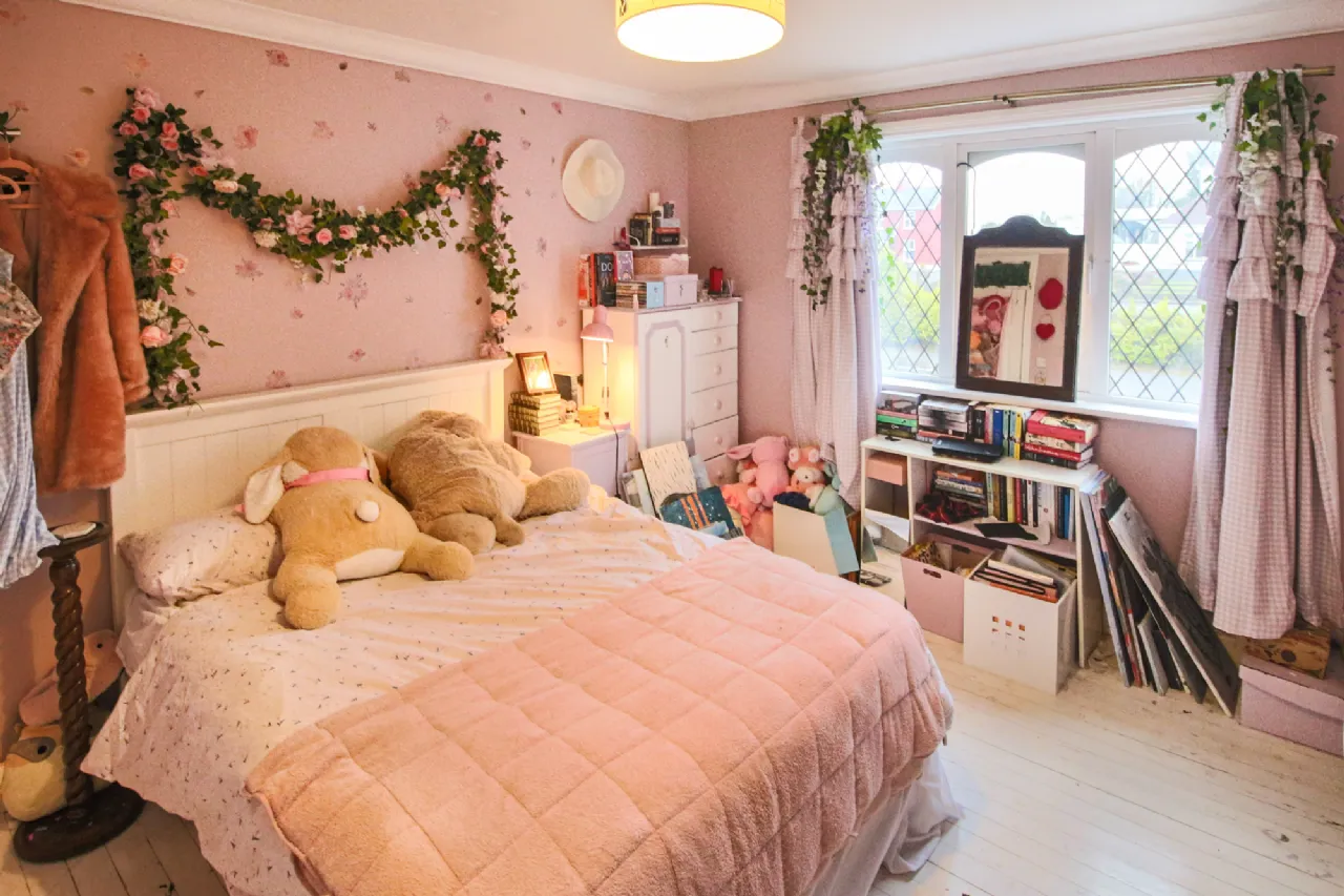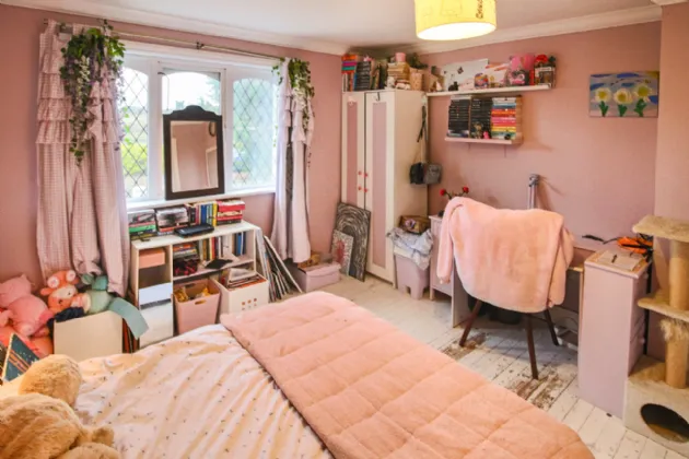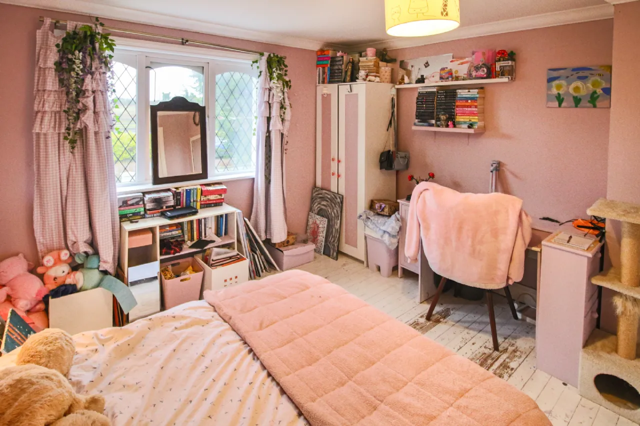 Bedroom 3 4.28m x 3.64m T&G wood flooring, curtain pole with curtains & blind.