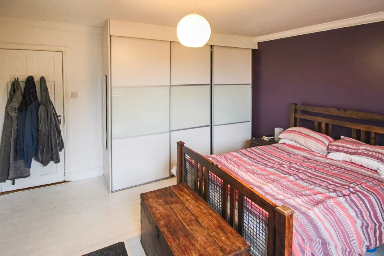 Bedroom 1 4.25m x 4.1m Painted T&G wood floor, built-in sliding door wardrobe, coving, window & blind.