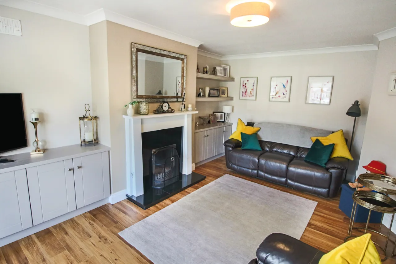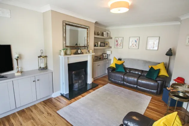 Living Room 5.14m x 3.13m Open fireplace, wood flooring, built in cabinetry, bay window, drapes & window blinds, radiator x2, coving.