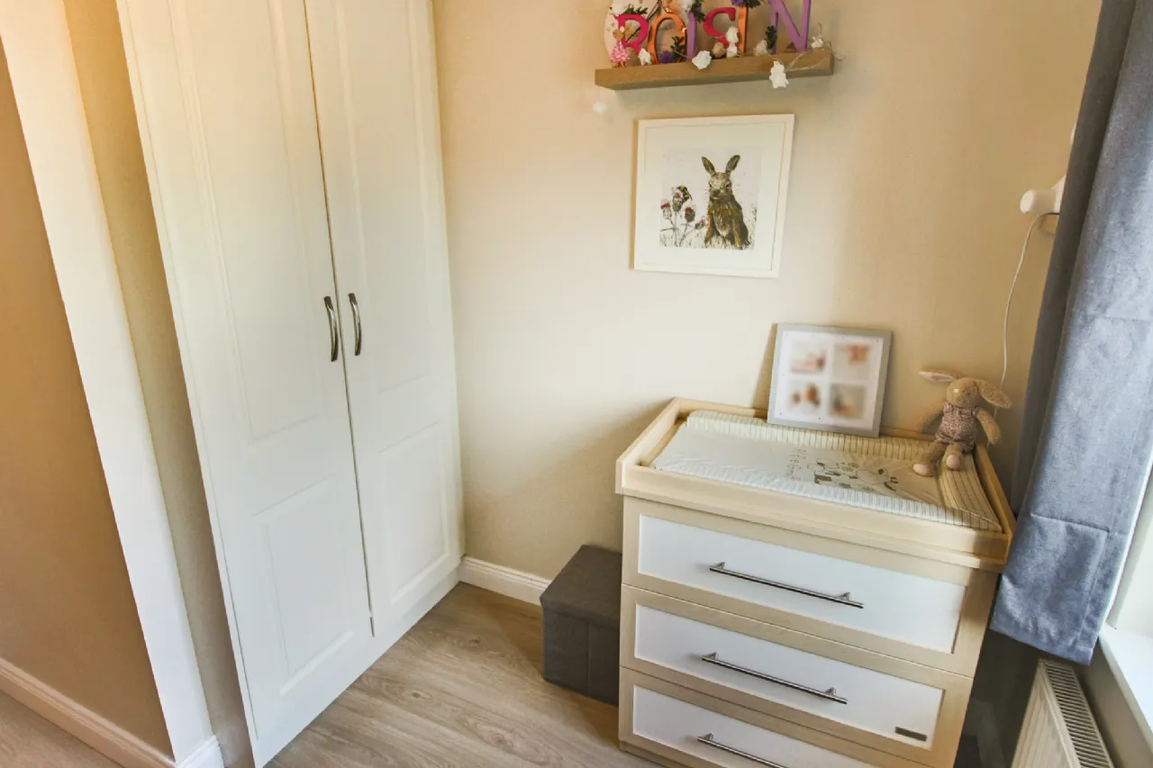 Bedroom 4 2.55m x 2.43m Wood flooring, built-in wardrobe, radiator, curtain pole & drapes, window blind.