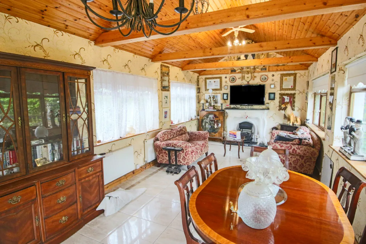 Sunroom 9.81m x 3.53m This expansive room is a standout feature of the property, offering a bright, welcoming space. Vaulted, timber-clad ceiling with exposed beams, glazed, wooden-framed double doors that open directly to the garden and an enclosed outdoor space. Faux fireplace feature, window blinds, feature ceiling lights, radiators x 2.