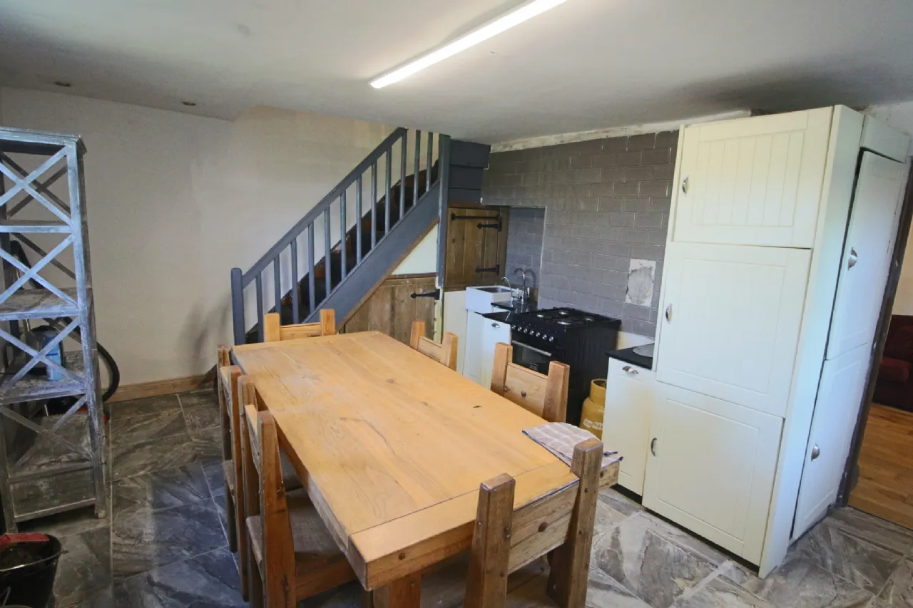 Kitchen/Dining Room 3.68m x 3.45m 'Stone' flag floor tiles, fitted cupboards with granite worktops, Belfast sink, water tap & softener/filter, electric cooker with gas hob, integrated Hoover fridge freezer, understairs storage & access to water cylinder, electric wall panel heaters x2, windows with granite cills x2.