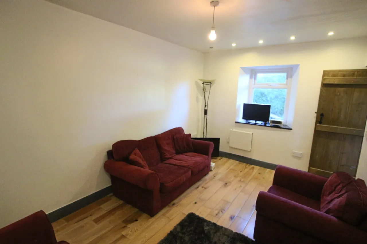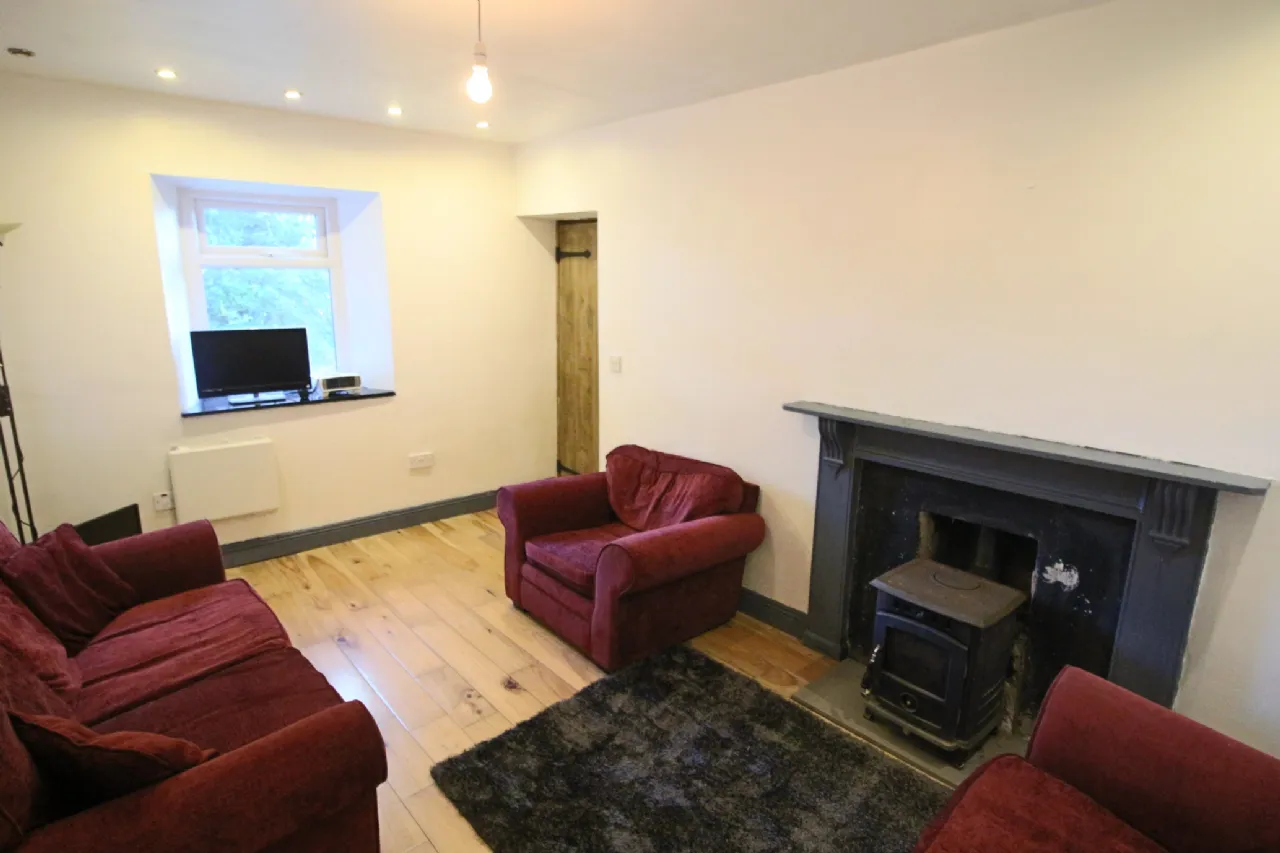 Living Room 4.5m x 2.37m Wood flooring, fireplace with painted surround & granite hearth, stand alone solid fuel stove, electric wall panel heater, window with granite cill, recessed downlighters. Carpeted stairs to first floor.