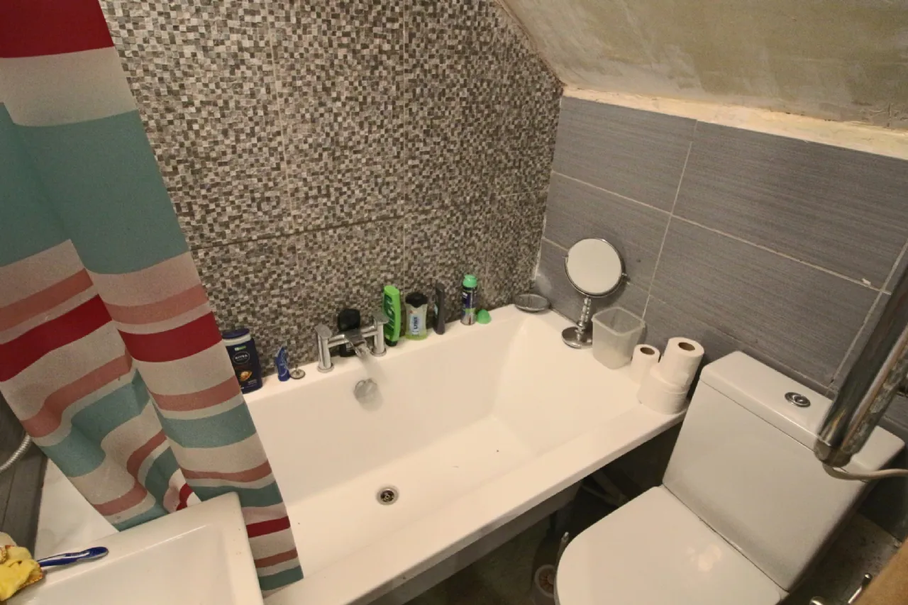 Bathroom 1.6m x 1.26m Wood floor, bath, chrome mixer taps, wall tiling, rain shower with hand spray, chrome heated towel radiator.