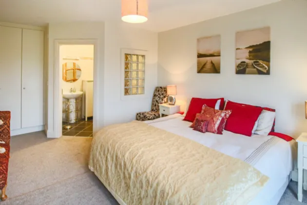 Bedroom 1 4.47m x 3.85m Carpet, feature wallpaper, glazed white oak doors x3, glazed door with side lights providing access to Juliet balcony with lake and mountain views.
