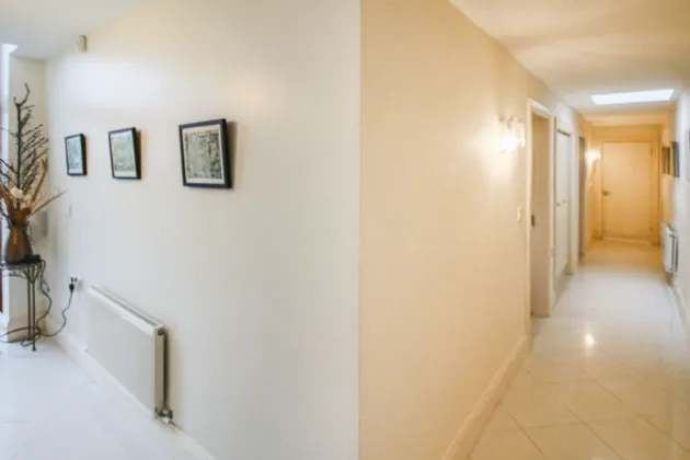 Garden Floor Hallway 12.27m² (132sq.ft.) Polished porcelain tiling, wall lights x2, radiator, Velux roof aperture, extensive fitted storage closets. Triple-height glazing feature with access door to garden