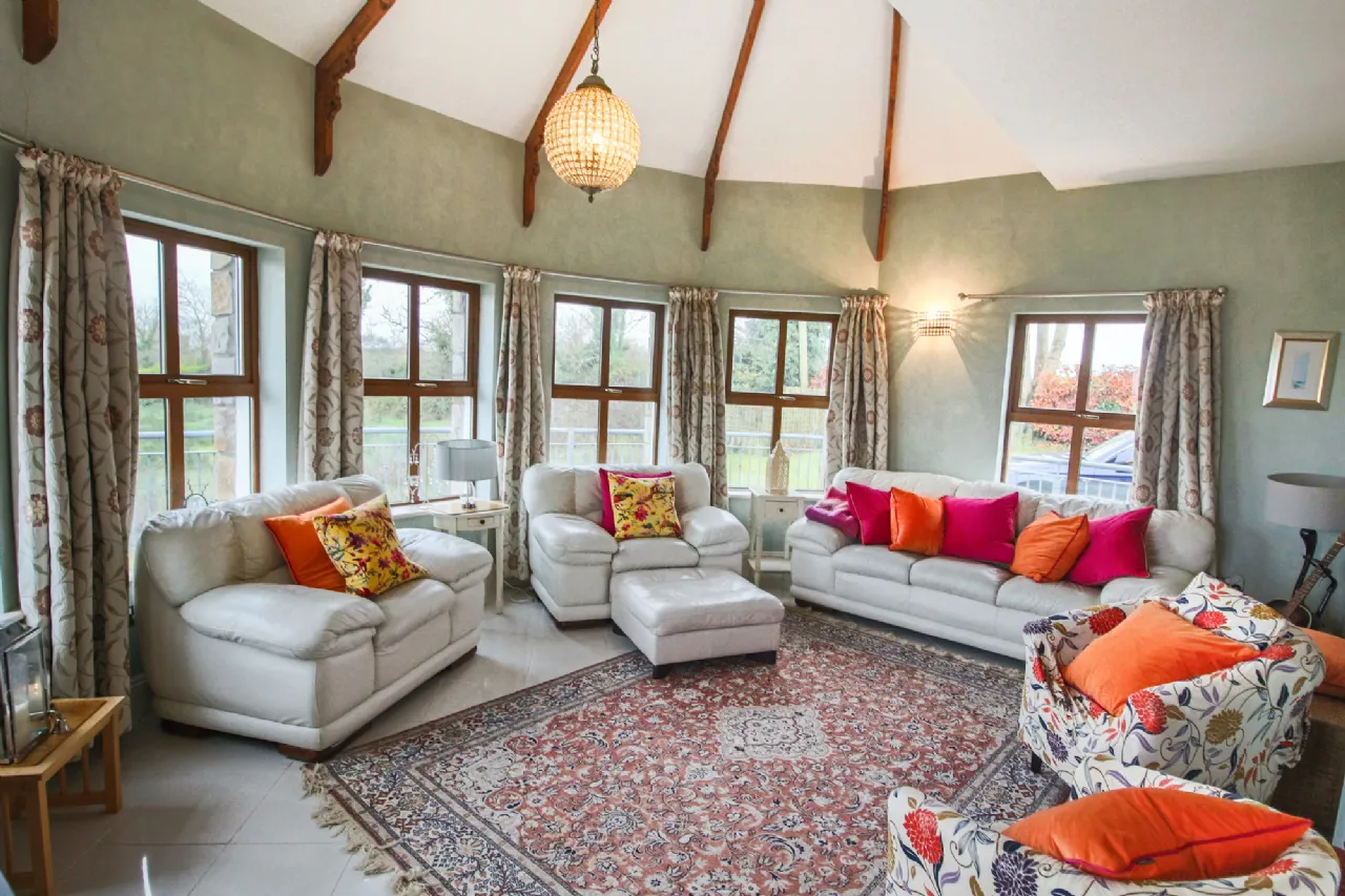 Sitting Room 5.76m x 4.37m A most attractive double-height space with vaulted, beamed ceiling feature, underfloor heating, gas stove with dual aspect, double white oak doors, polished porcelain floor tiles, crystal globe ceiling light fitting with antique bronze finish and matching wall sconces, chrome curtain poles & bespoke drapes. Semi-circular wall feature with seven windows and blinds fitted.