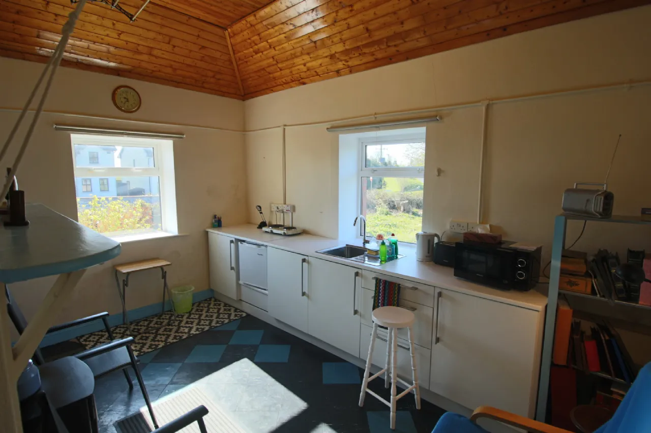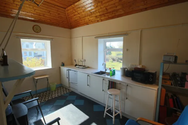 Living Room / Kitchen 4.34m x 3m Vinyl floor tiling, original chimney breast feature with solid fuel stove on slate hearth, traditional high ceiling, fitted base cupboards with worktops, good natural light from two windows with blinds, electric storage heater