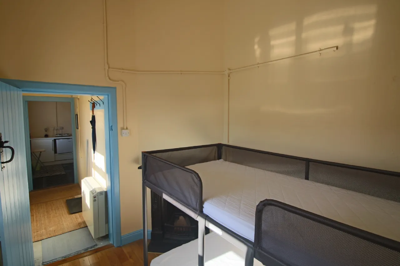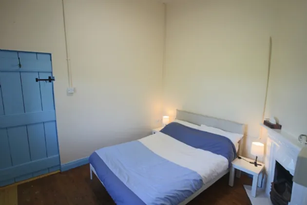 Bedroom 2 2.96m x 2.12m Wood floor, fireplace, window with blind, front garden views