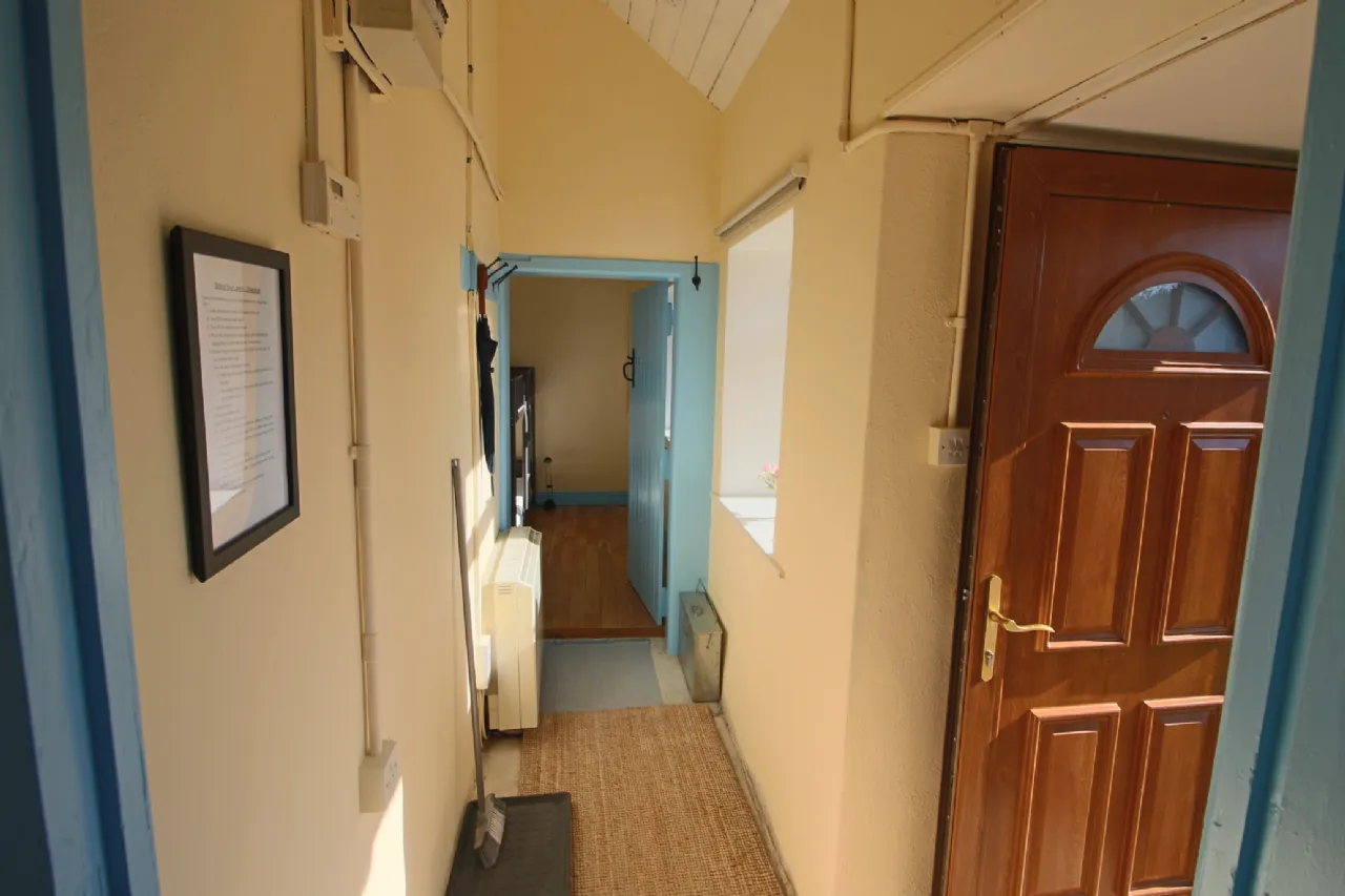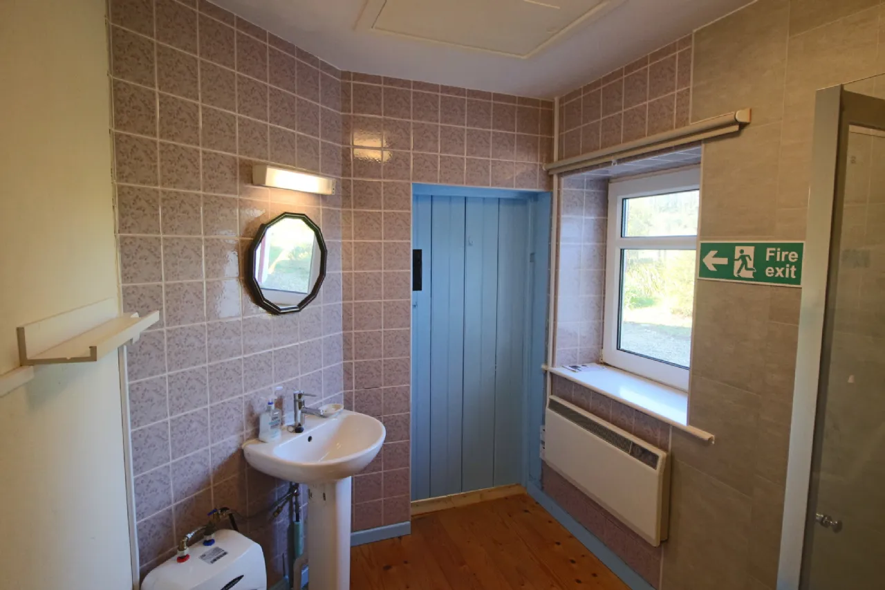 Bathroom 2.87m x 2m Wood floor, electric panel heater, window with blind, Triton T90 electric shower, chrome & glass enclosure, wall tiling, shaver point & light, wc & whb