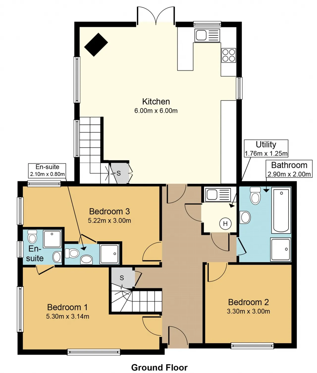 On the ground floor there are three bedrooms two of which have ensuite shower rooms and the third bedroom is served by a stylish bathroom with separate pumped shower.