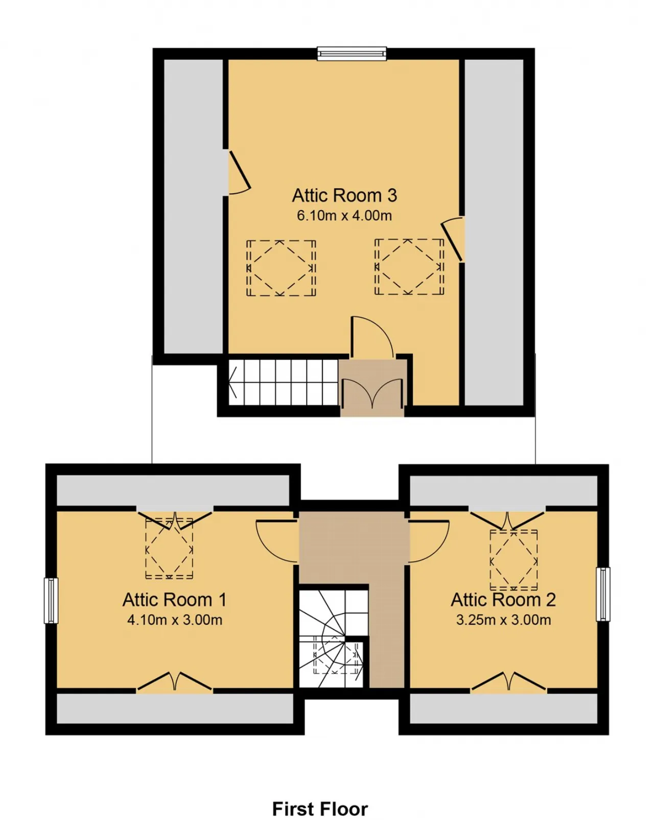There are two separate attic areas that have been converted. At the front of the house there are two attic rooms both with velux and gable windows. At the rear, above the kitchen living area, is a larger attic room with two velux windows and a gable window.