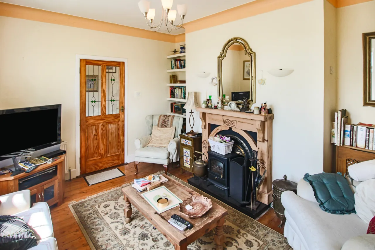 Living Room 4.52m x 3.33m Wood flooring, bay window feature curtain pole & drapes, radiators x 3, centre rose & coving, ceiling light fitting & wall uplighters. Fireplace with solid fuel stove. Lovely light filled room.