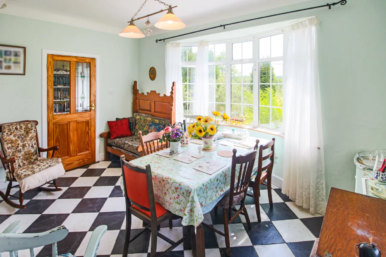 Dining Room 4.52m x 3.11m Floor tiling, bay window and side window, curtain poles & drapes, feature chimney piece with tiled inset and Stanley oil fired range - back burner for heating water, centre rose & coving, radiators x 2, airing cupboard, ceiling light fitting.