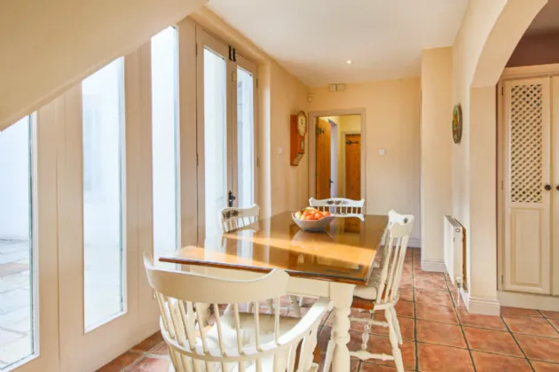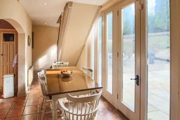 Open Dining Area 3.8m x 2.1m Ceramic 'flag' floor tiling, glazed double doors with side lights out to stone patio with south-easterly aspect, downlights, radiator.