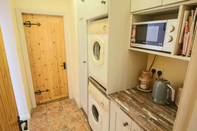 Utility Room 2.33m x 1.26m Fitted units with stacked Hotpoint washer & dryer.