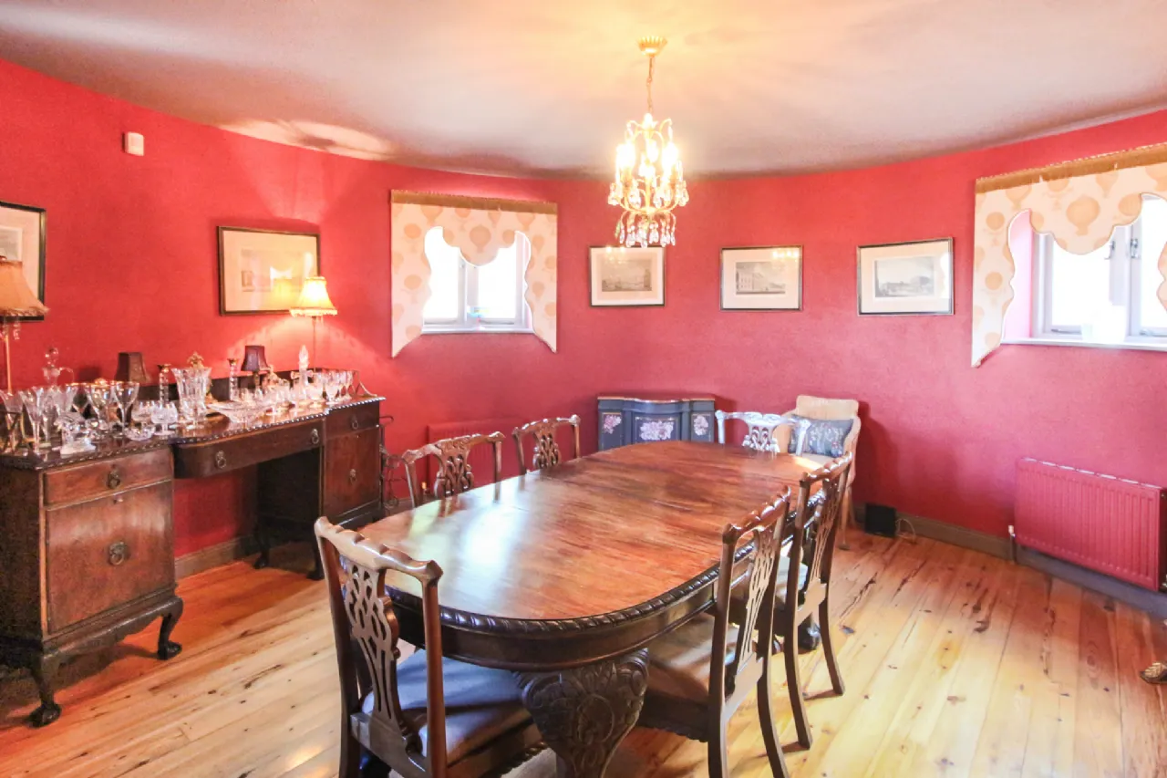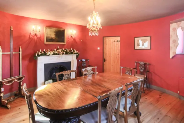 Reception/Dining Room 5.38m x 5m Round room with Reclaimed flooring, ornate marble fireplace with cast iron inset and grate, granite hearth, wall sconces, windows x2 with bespoke fabric braided pelmets, radiators x3, traditional sheeted doors and ironware, chandelier light fitting.