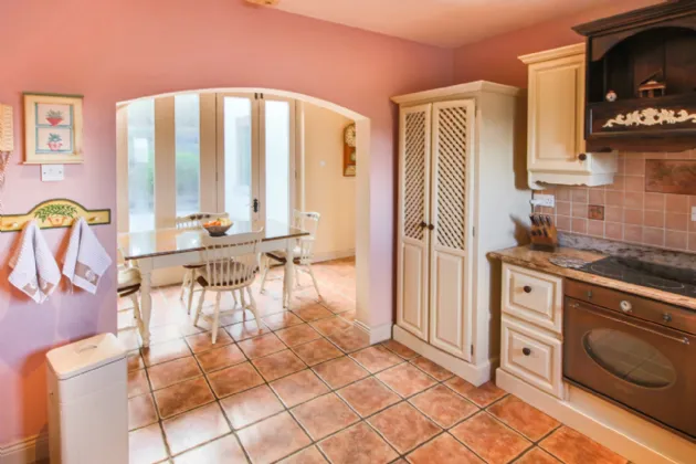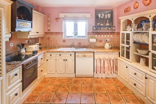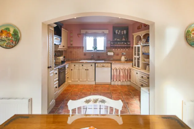 Kitchen 3.73m x 2.88m Handmade painted base and cupboard units with granite worktop and upstand, tiling to wall, ceramic sink unit with chrome faucet, Hotpoint dishwasher, ceramic hob and Smeg oven, Zanussi fridge freezer, wood pelmet and roman blinds, direct view of Sliabh an Iarainn.
