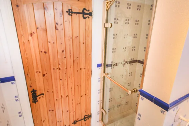 Bathroom 3.31m x 1.98m Tiling to floor and wall, ornate ceramic bath, wc & whb with floral motif, wood panel to bath with mixer tap and hand spray, wall lights, mirror and cabinet, shower enclosure with Triton T90 shower.
