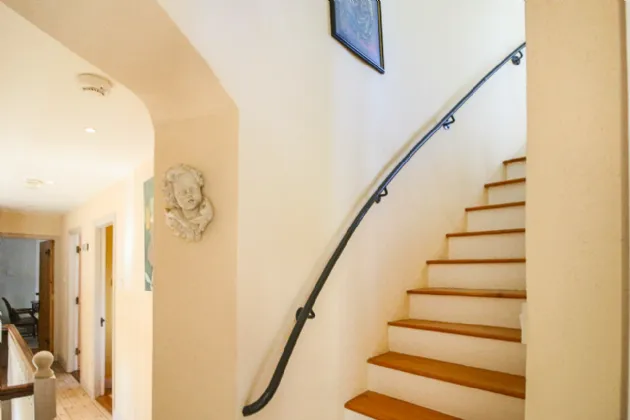 Bedroom 1 4.54m x 3.62m Carpet, windows x3 with curtain poles and drapes, phone point, downlights, built-in wardrobe. Side stairs with hardwood rail to upper floor.