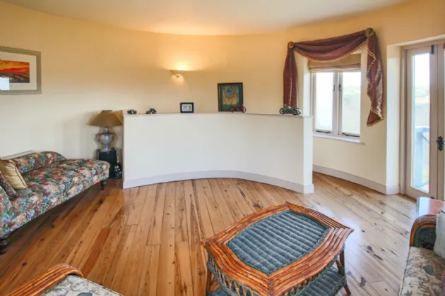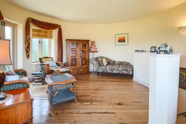 Studio 5.31m x 4.79m Reclaimed wood flooring, radiators x3, widows x3 with roman blinds and drapes, 2 glazed doors to wrap around balcony with stunning views of waterways and mountains. This is a most wonderful 'round' room with a fabulous aspect and proportions.
