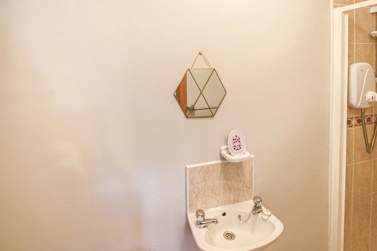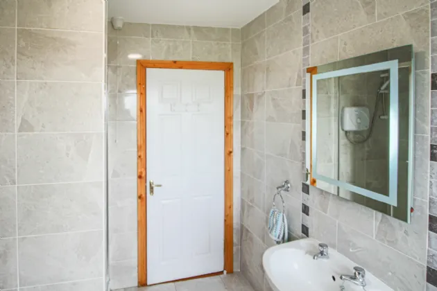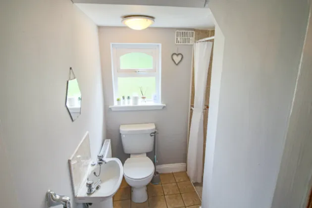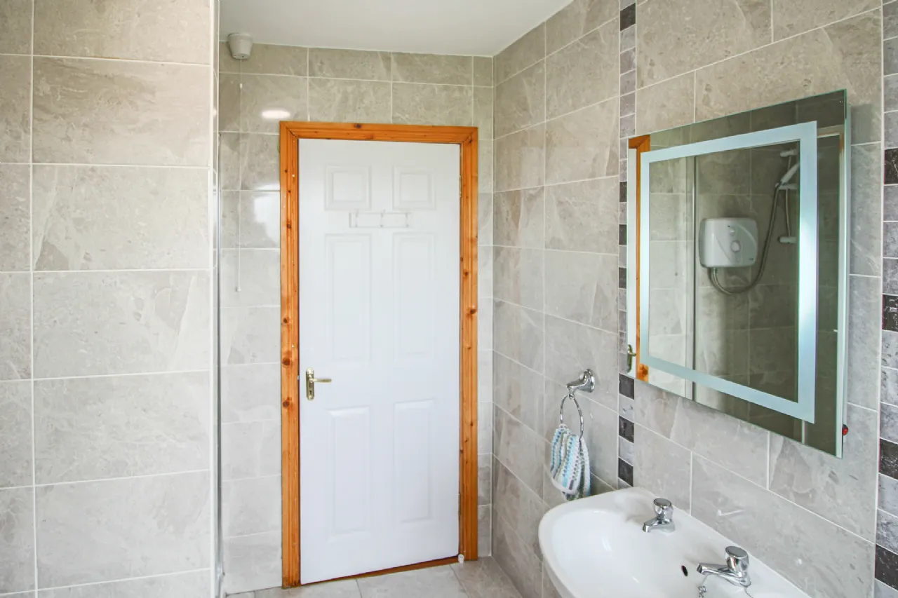 En-Suite 3m x 1m Tiled, shower enclosure with MIra electric shower, chrome towel rail, wc&whb.