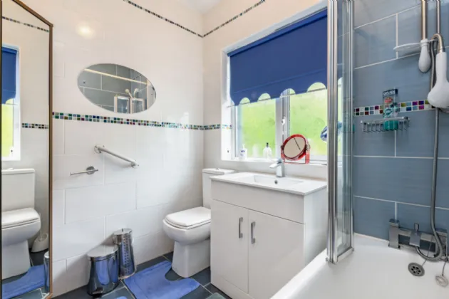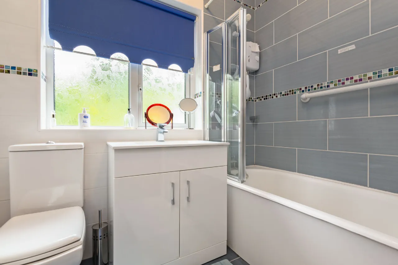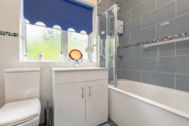 Bathroom 2.2m x 1.8m wc, whb, bath with shower overhead, full wall & floor tiling