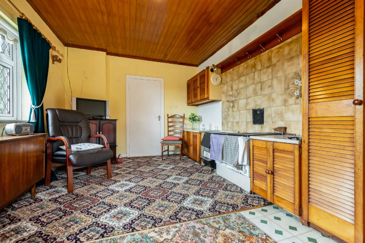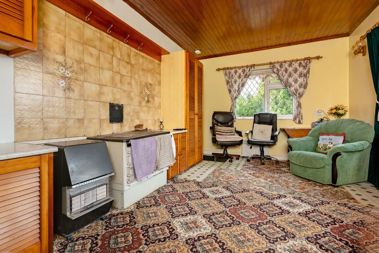 Sitting room 5.2m x 3.3m solid fuel range, fitted units