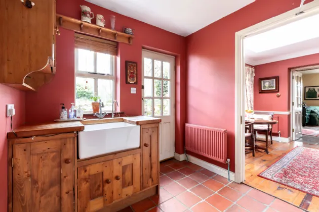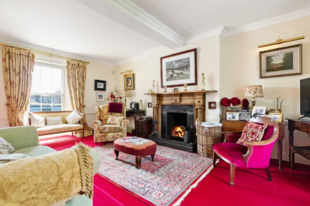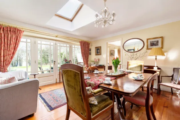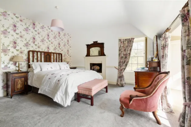 A charmingly decorated entrance hall with classic Victorian tiling welcomes you into Clooncoe House. A front drawing room to the left has a dual aspect, looking on to the lawns and gardens. This space exudes elegance and could comfortably accommodate large parties. On the other side of the hall a door leads to an inner hallway. Off this is the kitchen which holds a Stanley range, exposed ceiling beams and original flagstone flooring, creating a very homely and cosy family space. At the end of the hallway is the magnificent formal dining room. This is a bright and light- filled space with solid wood flooring and large double doors providing a seamless transition onto the patio where one can enjoy views of the water and surrounding countryside. Beyond this lies a generous double bedroom with an ensuite bathroom and views of the magical woodlands.