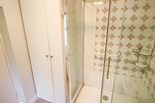 Bathroom 2.15m x 2.13m Carpet, Shower enclosure, wall mirrors x2, chrome fittings, built-in storage cupboards, wrought iron curtain pole, WC & WHB