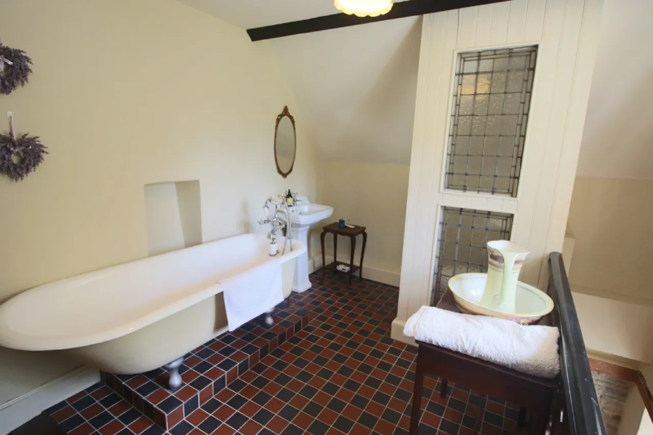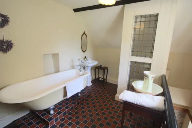 Stairs to first floor Bathroom 4.40m x 3m Wood flooring and raised tiled area with roll top, cast-iron bath with chrome mixer tap and hand spray, whb on pedestal, opaque leaded lights enclosure with wc, decorative wood panel.