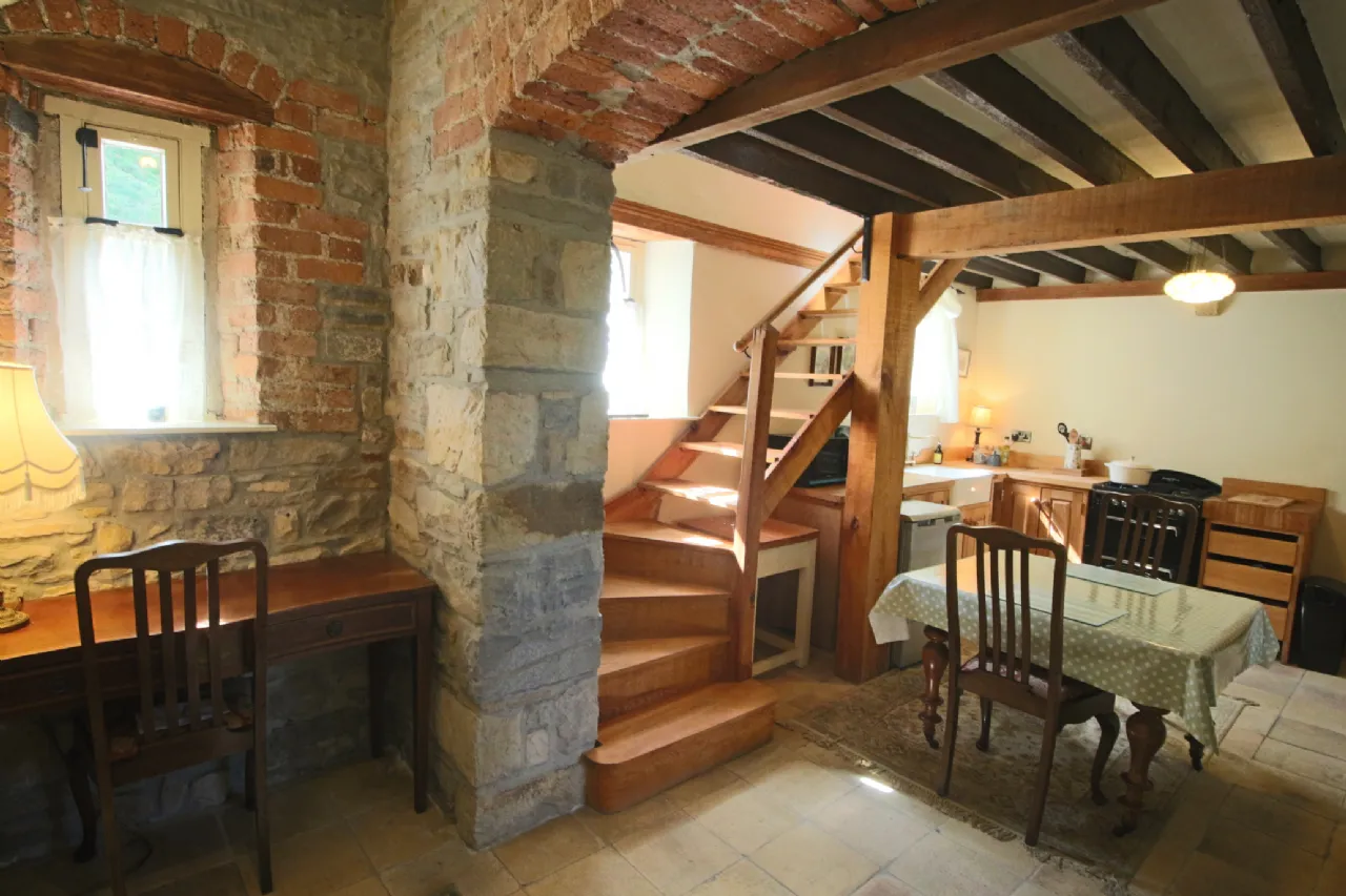 Kitchen/Dining Area 6.19m x 3.10m Flagstone floor, handmade brick features, beamed ceiling, solid fuel, double sided stove, Bespoke cabinetry, butchers block, gas hob & double ovens, Belfast sink with bronze mixer tap, Bronze lanterns x 2, Art Deco ceiling light, wrought iron period radiators x 2, exposed brick arch and wall feature, windows x 4, wrought iron curtain pole with draped curtain, bronze sockets & switches, heating controls.